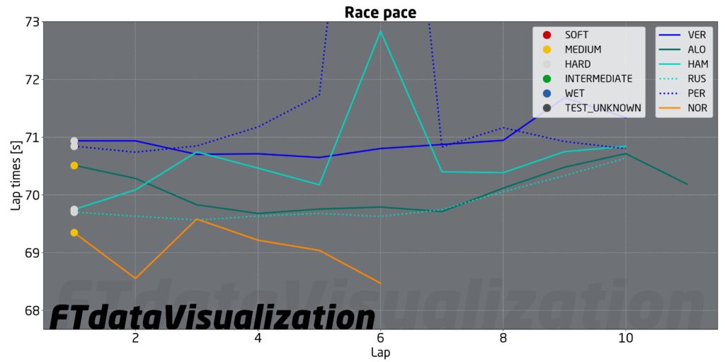 A causa del format del weekend che comprende la Gara Sprint, i team hanno avuto solo una sessione di prove libere per provare il passo gara, trovare il giusto assetto ed effettuare le simulazioni di qualifica. Per questo motivo risulta quasi impossibile capire cosa abbiano fatto le varie squadre e con quanta benzina abbiano lavorato. Sotto riportiamo per esempio sei long run percorsi dai top team. La Ferrari ha alternato giri sull’1:08 a giri di raffreddamento senza effettuare una vera e propria simulazione di passo gara. Si nota una Red Bull che è stata in grado di girare sull’1:10 alto con gomme hard, verosimilmente con un alto carico di benzina. Norris invece ha girato sull’1:09 con le medie, probabilmente a simulare la Gara Sprint con meno carico di benzina. A questo punto rimane da capire cosa stessero facendo Aston Martin e Mercedes tra l’1:09 alto e l’1:10 basso: una simulazione di Sprint più lenti della McLaren o una simulazione di gara più veloci della Red Bull? La Ferrari riuscirà a gestire le gomme? Domande alle quali è impossibile rispondere senza i dati delle prove libere. A domenica l’ardua sentenza.