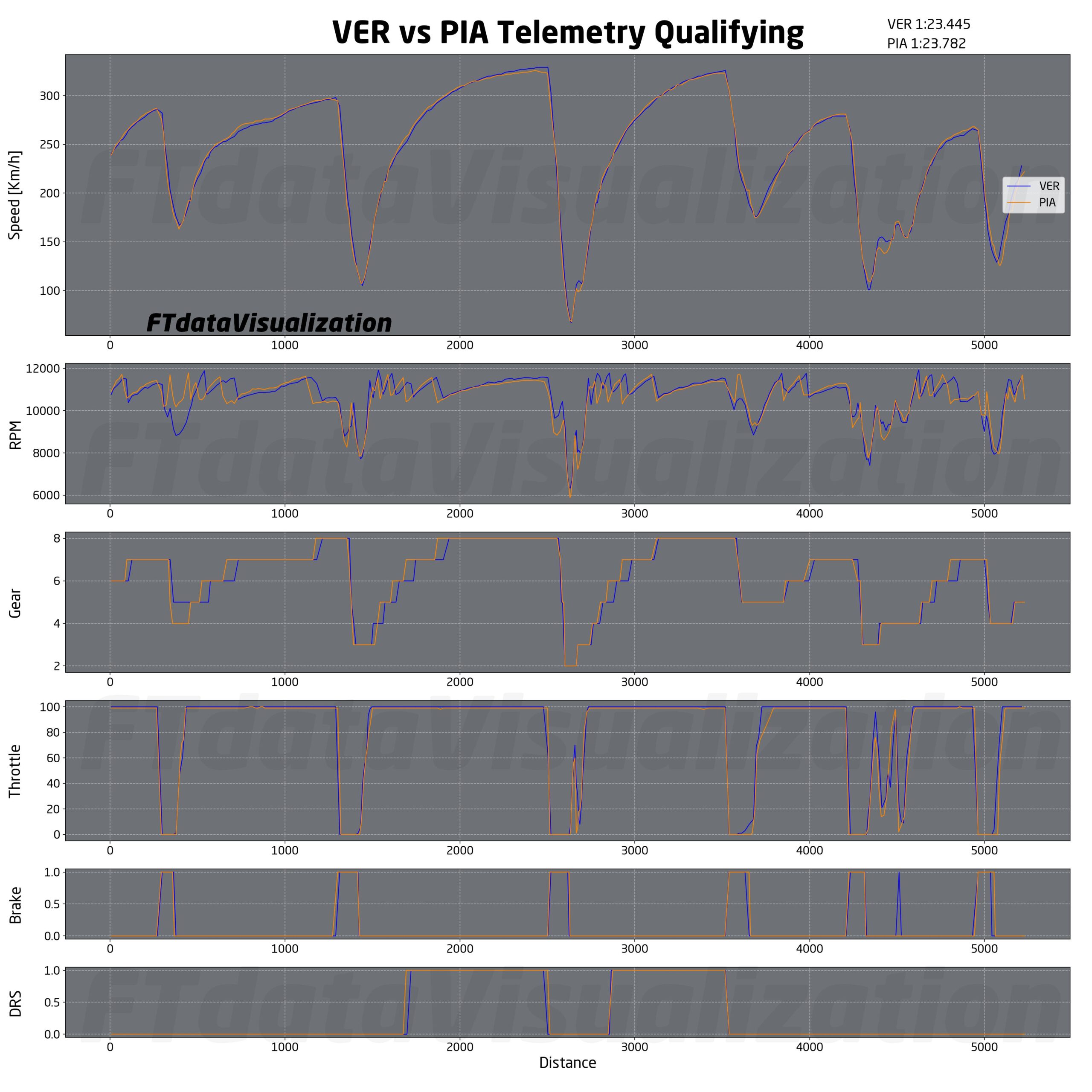Passiamo ora ai due piloti della McLaren. La monoposto di Woking è stata la migliore nel primo settore grazie alla maggiore capacità di accelerare in curva 3, una curva affrontata in pieno da tutti, ma nella quale McLaren pare riuscire a perdere meno velocità durante la sterzata. Nel resto del circuito la vettura si comporta abbastanza bene, ma paga qualche km/h di velocità in rettilineo rispetto a Red Bull e Ferrari. I due piloti McLaren hanno accentuato ancora più di Leclerc l’approccio di curva 12 e 13. Piastri e Norris infatti sono stati tra i più veloci di tutti in curva 12 insieme a Leclerc, ma sono risultati tra i più lenti in curva 13, curva nella quale Norris ha anche commesso l’errore che gli è costato una probabile prima fila nell’ultimo tentativo. Notiamo anche come, data la lentezza in curva 13, né Piastri né Norris tocchino il freno prima di curva 14.