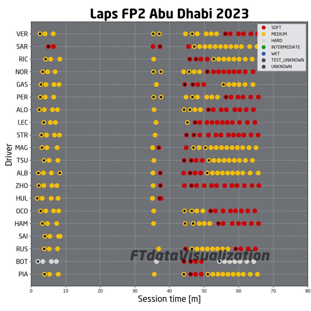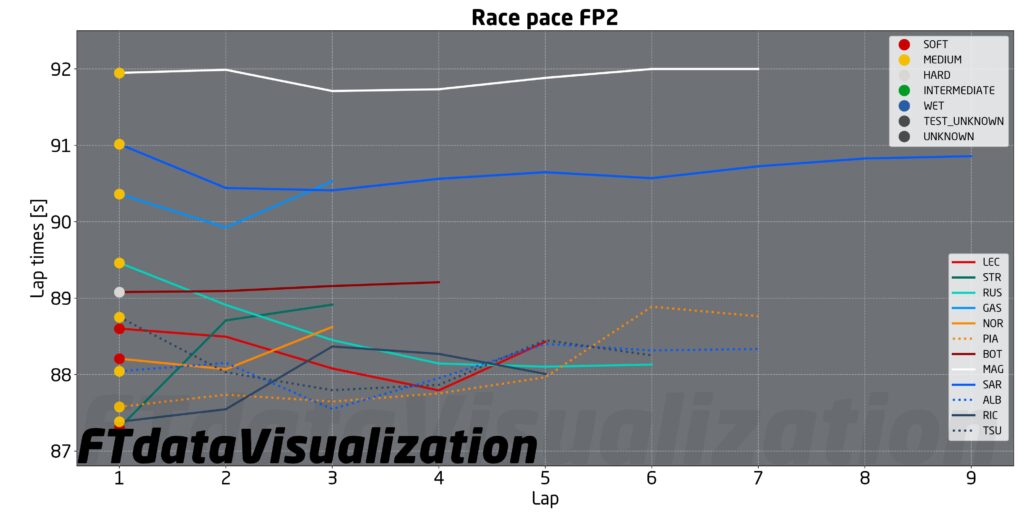 Nelle simulazioni effettuate alla fine delle FP2 i piloti che sono partiti con più calma sono riusciti a gestire meglio la gomma nel breve run effettuato. Notiamo infatti come Piastri, partito su tempi intorno all’1:27.5 abbia visto i suoi tempi salire fino all’1:28 alto mentre Russell, partito sull’1:29.5, sia sceso fino all’1:28 basso. C’è da dire che Piastri in questa stagione ha sempre sofferto sul passo gara nei confronti di Norris, quindi non ci sarà da stupirsi se in gara il #4 riuscirà a mantenere gli ottimi tempi fatti segnare da Piastri più a lungo. Buon run anche per Albon, intorno all’1:28, che ha girato molto probabilmente con un carico di benzina molto inferiore a quello del compagno di squadra Sargeant. Il pilota statunitense ha infatti girato con tempi estremamente costanti, ma sul passo dell’1:30 alto. Discorso simile per Magnussen, che ha pagato circa un secondo al giro dalla Williams. C’è da dire però che la Haas ha sempre sofferto tantissimo il degrado gomme nel corso dell’anno, anche per run brevi, mentre questa volta, nonostante la lentezza, pare un po’ più costante. Run molto buono invece per le due AlphaTauri di Tsunoda e Ricciardo con le medie. Leclerc ha invece girato circa mezzo secondo al giro più piano di Piastri con le soft, probabilmente per gestire meglio la gomma.