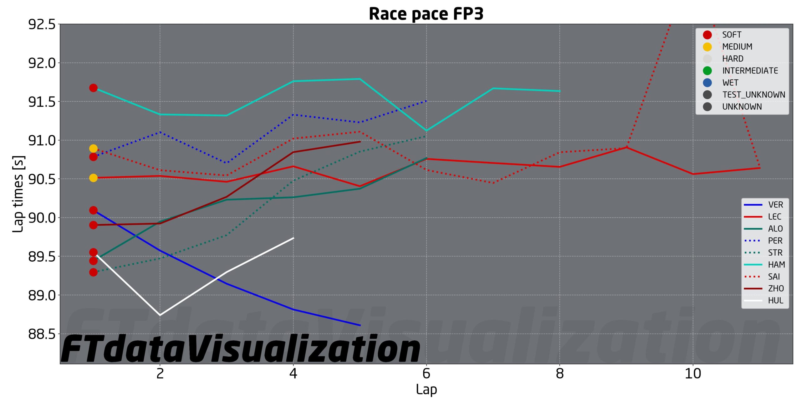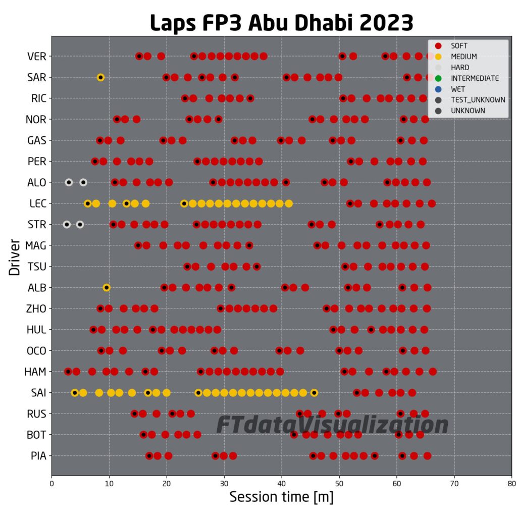 Durante le FP3 diversi piloti hanno effettuato altre simulazioni di gara. Le più lunghe sono state fatte da Ferrari, con le medie, e Hamilton con le soft. I due piloti del cavallino sono riusciti a girare stabilmente tra l’1:30.5 e l’1:31 mentre Hamilton ha girato su tempi intorno all’1:31.5. Con queste premesse Ferrari sembra favorita per la gara rispetto a Mercedes, ma è importante ribadire che le temperature dell’aria e soprattutto della pista durante le FP3 siano molto maggiori di quelle che ci saranno in gara, quindi i valori di forza potrebbero variare. Passando alle due Red Bull che hanno girato con le soft, Verstappen ha iniziato sull’1:30 basso scendendo fino all’1:28 alto mentre Perez ha iniziato a girare intorno all’1:30 alto per salire fino all’1:31.5. Difficile dire se i due piloti avessero carichi di benzina differenti o spiegare questa enorme differenza di andamento. I dati di Aston Martin invece sono apparsi più chiari: i due piloti infatti sono entrambi partiti dall’1:29.5 con le soft per arrivare all’1:30 alto dopo 6 giri. Stesso andamento per Zhou.