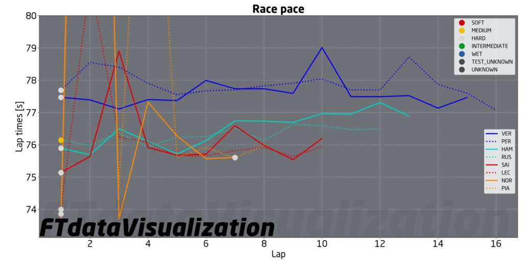 Sul passo gara Norris e Verstappen hanno tenuto un ritmo inavvicinabile per tutti gli altri nel corso dei 24 giri della Sprint Race. L’olandese è stato costretto a gestire meno di quanto avrebbe voluto, tanto che dal muretto gli hanno detto di spingere di più nelle curve veloci per evitare che il gap scendesse troppo, ma è comunque apparso in controllo della situazione. Verstappen ha fatto valere la migliore gestione gomma rispetto alla McLaren, al punto che nel finale è riuscito ad abbassare ulteriormente i suoi tempi fino a scendere sotto l’1:15 mentre Norris è rimasto sull’1:15 basso. A conferma dell’ottima gestione gomme della Red Bull c’è il fatto che anche Perez è riuscito a portarsi sui tempi di Norris alla fine dello stint mentre nella parte centrale, con pista libera, girava più di mezzo secondo al giro più lento del #4. Più in difficoltà invece l’altra McLaren, quella di Piastri. Il rookie australiano, nonostante in qualifica stia dimostrando prestazioni eccezionali e spesso a livello del compagno di squadra, è ancora molto distante da Norris sul passo gara.