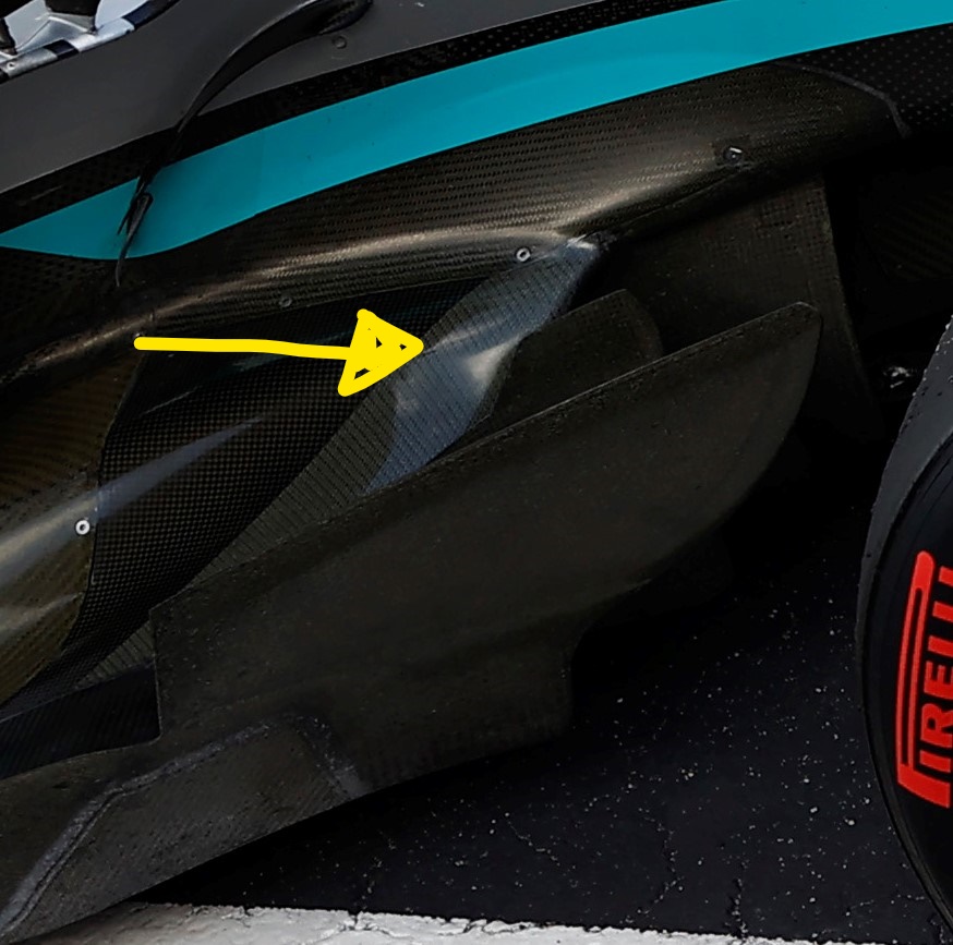 Dalle immagini in 144p della Mercedes W14 il bordo d’attacco del fondo sembra più dritto | © Mercedes-Benz Group AG