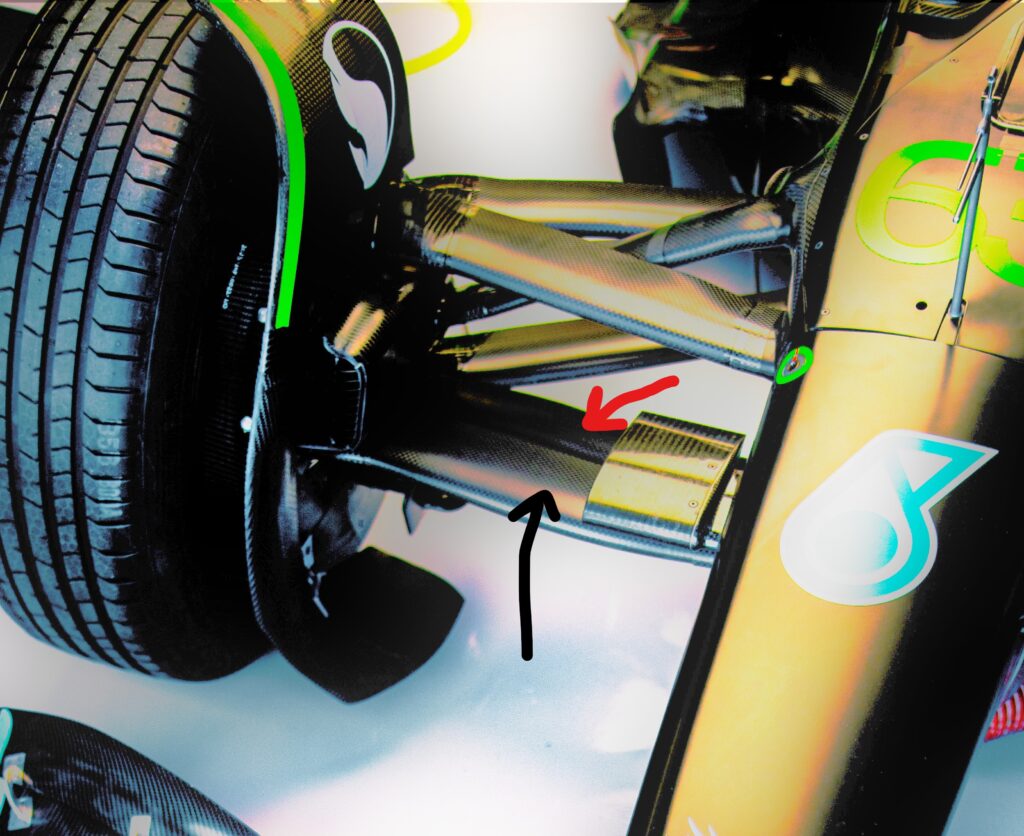 Lo schema sospensivo rimane push-rod come lo scorso anno. La novità principale è lo spostamento del tirante dello sterzo dalla parte alta, quindi allineato con il triangolo superiore, a quella bassa, allineato con il triangolo inferiore come sulla Haas VF-23 e sulla Ferrari SF-23. Grazie a questa modifica la scatola dello sterzo è collocata più in basso in modo tale da abbassare il baricentro della vettura. Dal punto di vista aerodinamico cambia leggermente l’utilizzo dell’elemento: sulla W13 si cercava di pescare aria pulita dalla parte alta per spingerla verso il fondo mentre sulla W14 probabilmente si cerca di riallineare il flusso della nuova ala anteriore che genera più upwash nella parte centrale.