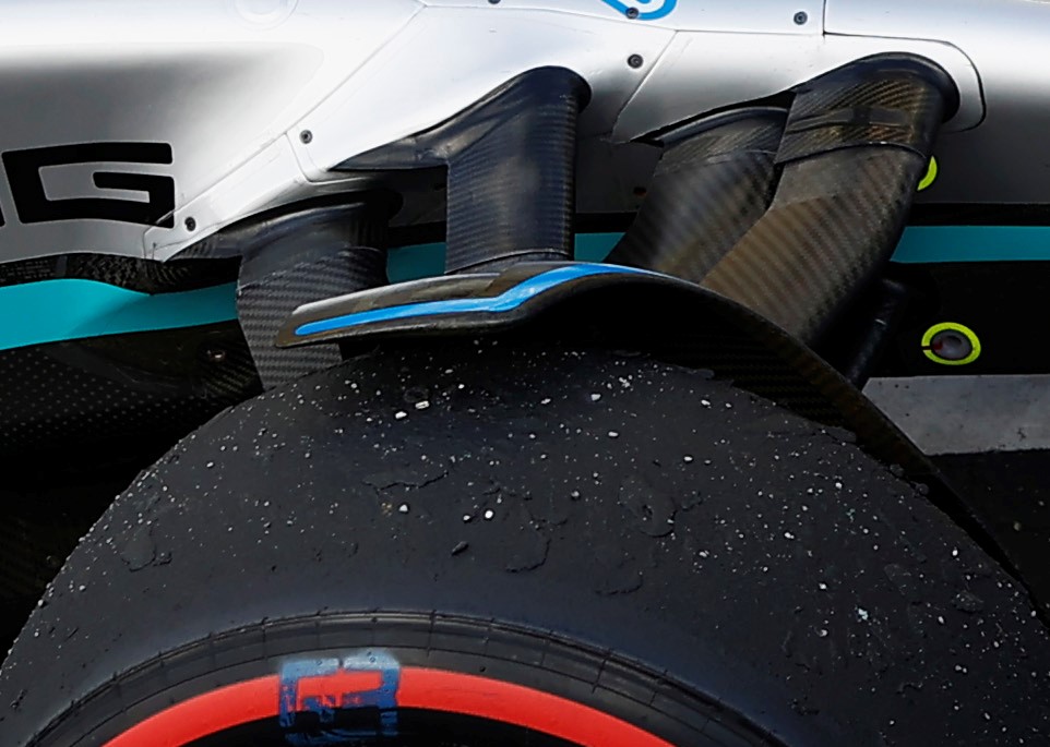 Le novità che più saltano agli occhi sono ovviamente le fiancate. Nonostante Mercedes non abbia abbandonato la filosofia a pance verticali dello scorso anno, il raffreddamento della monoposto pare sia stato rivisto. Tanto per cominciare l’ingresso delle pance non si va più ad allargare verso il basso, ma mantiene una sezione costante lungo l’asse verticale. Inoltre dietro l’attaccatura dell’halo sono comparse due vistose condutture che portano l’aria calda al retrotreno in modo tale da non disturbare i flussi lungo il corpo vettura. Sulla parte alta si notano anche due piccole feritoie utili a far uscire parte di questa aria calda nella parte superiore della macchina.