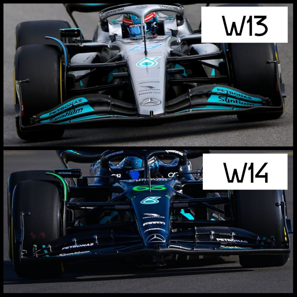 L’ala anteriore della Mercedes W14 è stata completamente cambiata rispetto a quella dello scorso anno. I flap sono più carichi nella parte centrale sulla falsariga di quelli della Ferrari F1-75 del 2022 e inoltre gli elementi metallici che collegano la parte regolabile del flap con quella fissa sono più orientati verso l’esterno rispetto a quelli dello scorso anno. Pare evidente il tentativo di riposizionare il vortice generato da questi in modo che esso si integri con il nuovo fondo. Passando al muso invece si nota come quest’anno sia più tondeggiante e leggermente più stretto in modo da ridurre quanto più possibile il disturbo aerodinamico del flusso diretto verso il fondo e il corpo vettura.