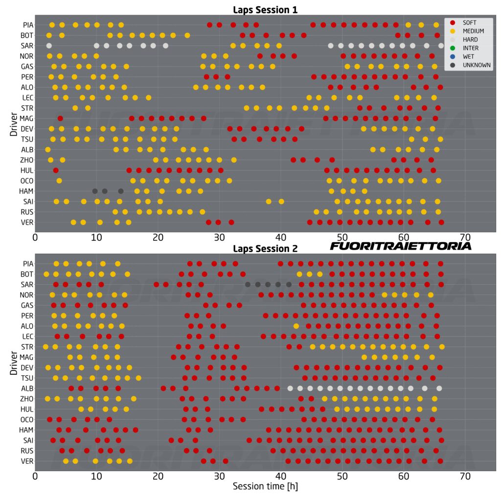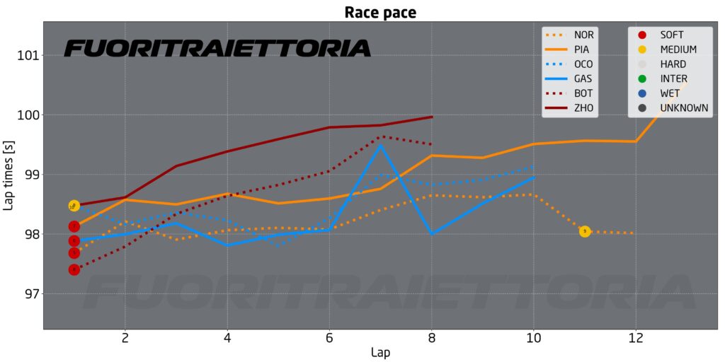 Passando a chi l’anno scorso occupò il centro gruppo, Alpine e la McLaren di Lando Norris sembrano coloro in grado di conquistare le restanti posizioni in zona punti grazie a un passo costante tra l’1:38 e l’1:39. Un po’ più in difficoltà rispetto al compagno di squadra Oscar Piastri, come lecito aspettarsi da un, sebbene talentuoso, esordiente mentre Alfa Romeo rimane un’incognita. Il team di Bottas, dopo delle belle simulazioni di qualifica, ha mostrato un degrado decisamente elevato nei long run con gomma soft: un problema da risolvere in vista di domenica.