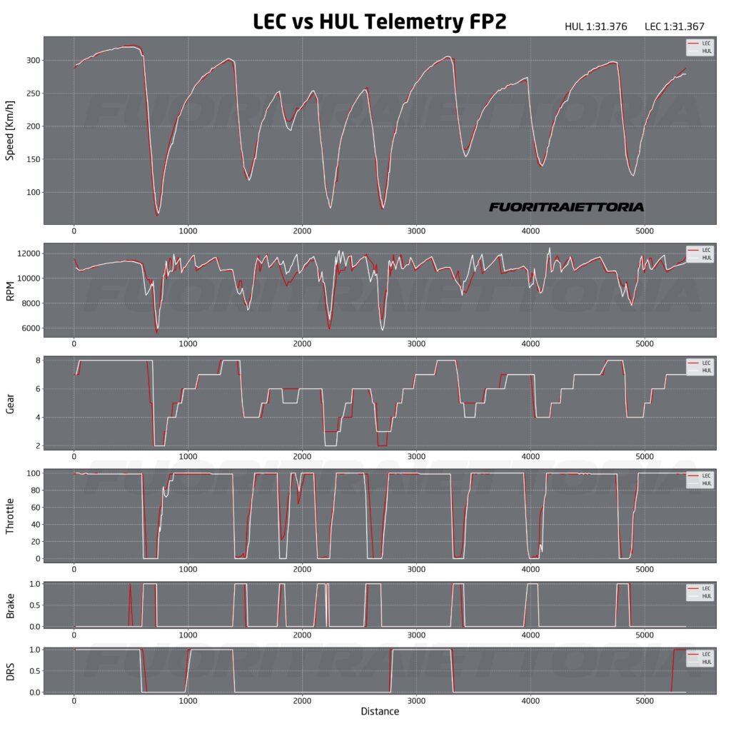 Ferrari che comunque potrebbe avere ancora un bel po’ di margine da come si intuisce paragonando il giro di Hulkenberg con quello di Leclerc. Guardando le velocità si nota come la curva della Haas sia molto più ripida in accelerazione, segno di una migliore accelerazione provocata probabilmente da una mappatura di motore più spinta rispetto a quella usata sulla casa madre.