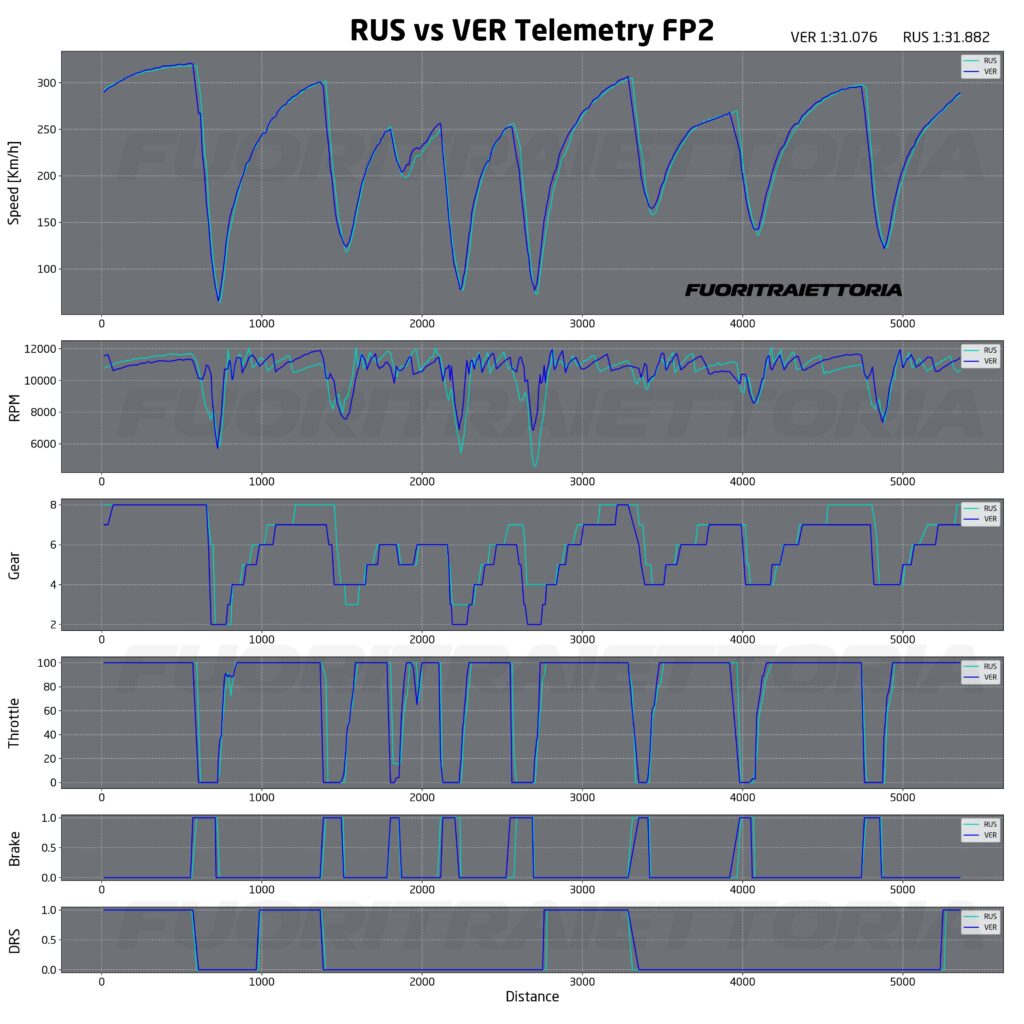 Passando infine alla Mercedes, i due piloti inglesi riescono incredibilmente a guadagnare in accelerazione sulla Red Bull, come un po’ tutti gli altri, ma perdono un’enormità nelle curve sopra i 140 km/h.