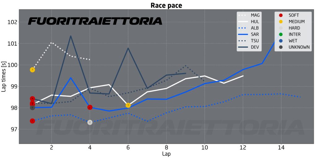Tra i team che lo scorso anno occuparono gli ultimi posti in classifica costruttori (Aston Martin esclusa) risulta ancora più difficile fare previsioni. Albon ha messo a segno un’ottima sequenza di giri veloci con gomme hard, forse a simulare la seconda parte di gara mentre Sargeant è il pilota che ha completato più giri con la soft mostrando come i tempi salgano alle stelle dopo il 17° passaggio. Degrado molto alto per l’unica Haas ad aver completato un numero decente di giri, quella di Hulkenberg, mentre AlphaTauri sembra poter ambire a una nebulosa posizione dalla P11 alla P20.