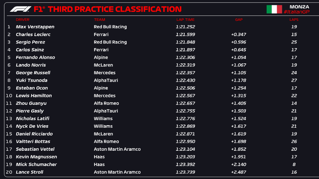 Subito fuori dai primi dieci Zhou (11°, +1.405 s) e Gasly (12°, +1.503 s). Molto bene la Williams che piazza Latifi e De Vries in tredicesima e quattordicesima posizione. Grazie alla pioggia di penalità il team inglese potrebbe ritrovarsi molto in avanti in griglia domenica e viste le velocità di punta potrebbe rappresentare grattacapo in più da risolvere per chi vuole rimontare. Ricciardo ha chiuso 15°, staccato di 1.619 s dal primo. Sessione di PL3 difficile anche per Bottas: il finlandese ha avuto diversi problemi in frenata e nella simulazioni di qualifica ha chiuso solo 16° a 1.698 secondi dalla vetta. Le ultime 4 posizioni sono state occupate dalle Haas e dalle Aston Martin. I due team sembrano destinati, ancora una volta, ad uscire in Q1.