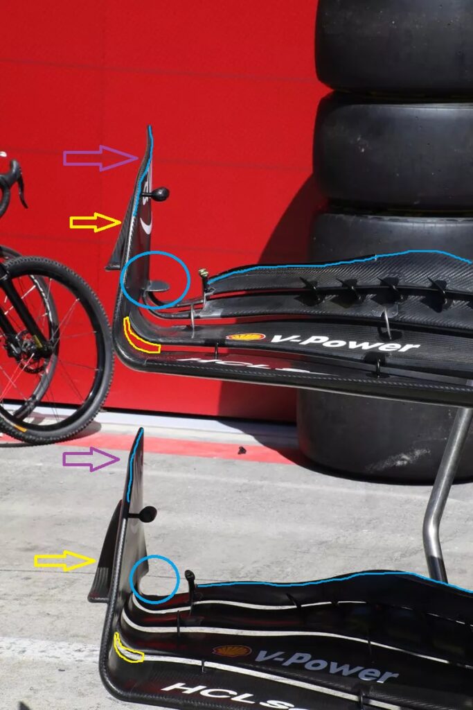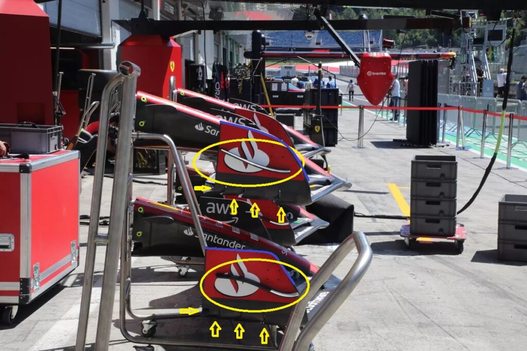 Per quanto riguarda l’ala anteriore i tecnici di Maranello hanno optato per riprendere un concetto portato ad inizio stagione da Red Bull e Haas, con un piccolo generatore di vortice ancorato all’endplate ed un’inclinazione verso l’esterno maggiore di quest’ultimo.