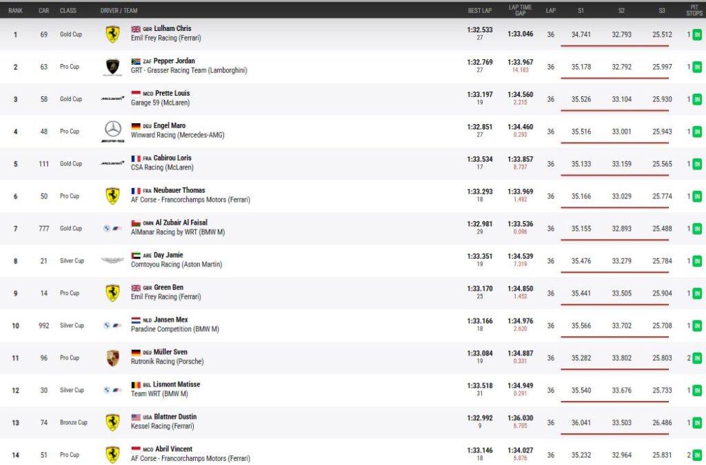 Dopo il giro di soste ai box, ad emergere per primo è Lulham a bordo della Ferrari #69 di Emil Frey Racing, seguito dalla McLaren #58 guidata di Louis Prette e dalla Lamborghini GRT #63 di Pepper. La Yellow Mabmba #48, dunque, è riuscita a risalire 4a.