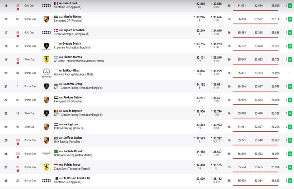 L’austriaco di Winward Racing deve assolutamente riguadagnare posizioni per accorciare maggiormente in classifica dato il magrissimo bottino raccolto dai diretti avversari e ora, dopo il periodo di Safety Car dovuto alla rimozione delle vetture incidentate, si trova 7° dietro alla leader Ferrari #74 (Marschall/Blattner), Porsche #89 (Buus/Mardini), McLaren Garage 59 #58 (Fleming/Prette), Ferrari Emil Frey #69 (Vermeulen/Lulham), McLaren #111 (Gachet/Cabirou), Lamborghini GRT #63 (Engstler/Pepper), e deve vedersi bene dall’arrivo alle sue spalle della BMW #777 dell’AlManar Racing, molto aggressiva.