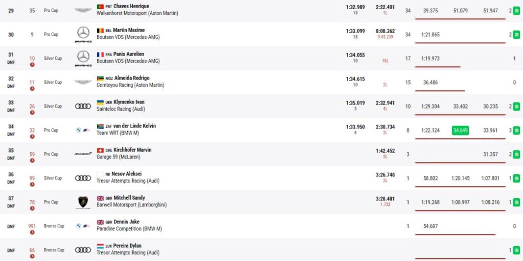 Ma è dramma sportivo anche per la McLaren #59, con un anteriore pesantemente danneggiato a causa di un contatto tra curva 2 e 3 con Porsche Rutronik #96 (con Niederhauser al volante), proprio una diretta rivale per il titolo! Ciò va benone al Team WRT, che vede i propri competitor uscire di scena proprio una curva dopo rispetto al punto in cui era stata centrata la BMW M4 #32. In tutto questo, la Ferrari #52 viene danneggiata dopo aver colpito il paraurti anteriore perso della vettura di Garage 59.