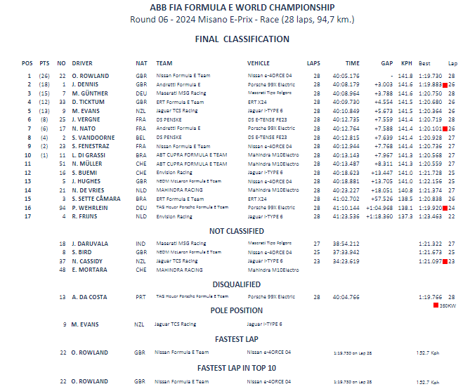 Chi però può addirittura essere più contento di Da Costa è Oliver Rowland, che con il quarto podio consecutivo (e con il punto del giro veloce) si porta in testa al mondiale. L’inglese della Nissan è stato bravo ad approfittare delle disavventure di Wehrlein e di Cassidy, che nella prima metà di gara hanno dovuto abbandonare la lotta per la vittoria per dei contatti, in entrambi i casi con Vergne: per questo motivo il francese, giunto terzo, è stato arretrato fino all’ottava posizione per una penalità di cinque secondi, concernente il contatto con Cassidy.