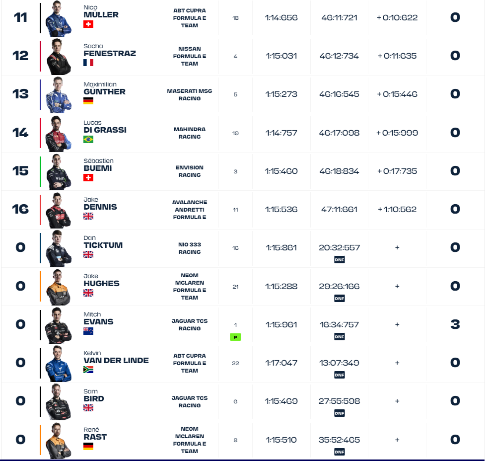 Si conclude così una gara ricca di azione in India, un tempo terra di conquista per gli inglesi trasformatasi oggi in una debacle per quasi tutti i team e piloti britannici. Solo Cassidy, neozelandese alla guida della britannica Envision, e Rowland, inglese alla guida della scuderia di casa Mahindra, sono riusciti a sfuggire al conto presentato dalla Storia. In basso la classifica finale.