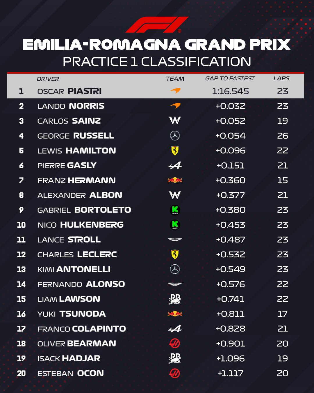 Va in archivio con una doppietta firmata McLaren le FP1 del GP dell’Emilia Romagna, settimo appuntamento nel calendario 2025 della Formula 1. Sul circuito che sorge lungo le sponde del Santerno le MCL39 di Oscar Piastri e Lando Norris hanno ripreso le fila del discorso esattamente da dove le avevano lasciate in quel di Miami, regolando allo sventolare della bandiera a scacchi tutti gli inseguitori.