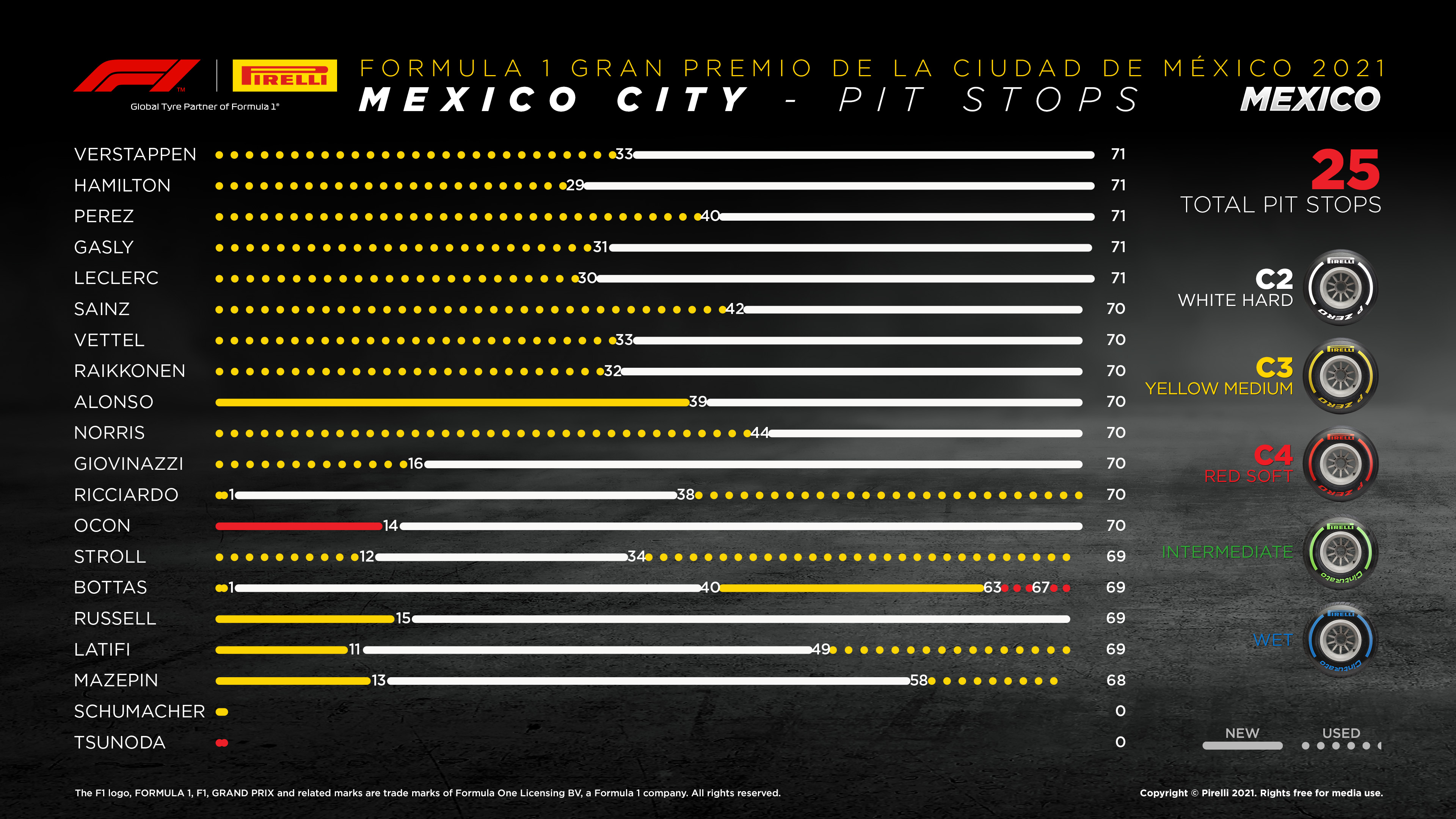Antonio, per via della sosta effettuata quando ancora il gruppone non si era del tutto sgranato, dopo il pit piomba – con le poco utili Hard tra le mani – alle spalle del duo Ricciardo – Bottas, lento sul passo gara ma velocissimo su quei rettilinei che anche in Messico sono l’unico luogo in cui è possibile effettuare un sorpasso. Giovinazzi tenta di avvicinarsi (stressando quelle stesse gomme che di lì a poco si sarebbero surriscaldate a causa della vicinanza della Mercedes #77), ma una volta messi nel mirino Ricciardo e Bottas non riesce più a fare nulla: il suo ritmo si plafona sull’1’23”3 – 1’23”5, esattamente un secondo al giro più lento di quello che Sebastian Vettel, con gomme Medium che saranno poi cambiate nel corso del 35° passaggio, riusciva a far registrare in 7^ posizione.