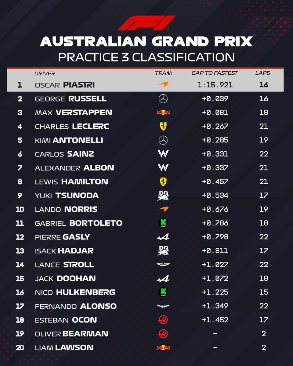 Buona è stata la prestazione del rookie Gabriel Bortoleto che, in barba alle parole non troppo gentili riservategli da Helmut Marko, ha conquistato l’11ª posizione davanti a Pierre Gasly e Isack Hadjar, mentre Lance Stroll ha chiuso al 14° posto in 1’16”948 una sessione di prove libere che ha consegnato al mondo della Formula 1 una Aston Martin apparentemente ancora in grossa difficoltà. Alle spalle del canadese si è poi messo Jack Doohan con la seconda delle Alpine, mentre Nico Hulkenberg in 1’17”146 ha portato la sua Sauber #27 davanti alla AMR25 #14 di Fernando Alonso, disperso nelle retrovie in un anno che rischia di trasformarsi in una sorta di calvario. Solamente 18° ha chiuso Esteban Ocon, ma peggio è andata al suo compagno di squadra Oliver Bearman e a Liam Lawson. Se quest’ultimo è stato fermato da un problema tecnico occorso alla sua RB21, il weekend australiano del #87 si sta trasformando in un vero e proprio incubo: Bearman, che già aveva saltato le FP2 per via dei danni riportati dalla sua Haas nell’incidente di cui si era reso protagonista durante le FP1, è infatti finito in ghiaia dopo pochissimi minuti dall’inizio delle FP3 venendo così nuovamente costretto ad alzare bandiera bianca mentre i commissari sventolavano la bandiera rossa.
