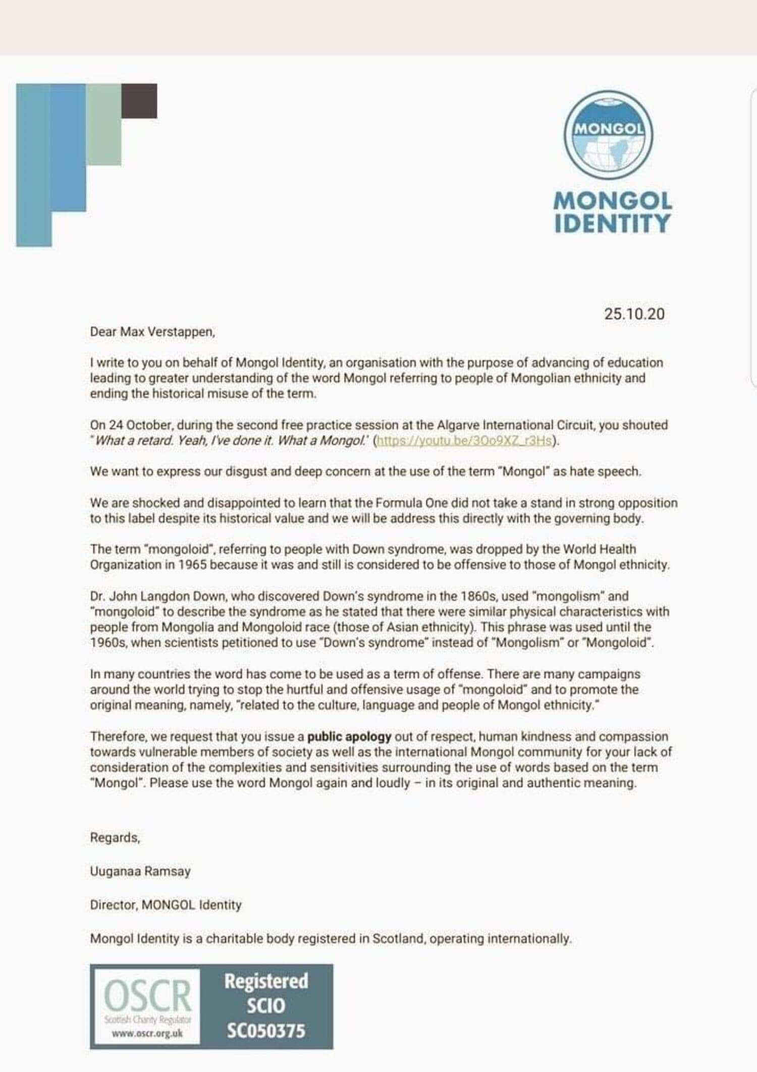 “Vogliamo esprimere il nostro disgusto e la nostra profonda preoccupazione di fronte all’utilizzo del termine ‘mongolo’ come insulto – si legge nel comunicato diffuso dall’organizzazione – “Siamo scioccati e delusi dal fatto che la Formula Uno non abbia preso una posizione per opporsi a questa etichetta nonostante la sua valenza storica, e di ciò ne parleremo con gli organi preposti”. Dopo un breve paragrafo in cui viene spiegato il perché questo termine sia stato utilizzato a scopo offensivo nel corso di tutti questi anni, Mongol Identity aggiunge che in diversi paesi del mondo sono attualmente in corso delle campagne volte a evitare che la parola “mongolo” venga usata con una simile accezione negativa, richiedendo per questo le scuse pubbliche di Max Verstappen.
