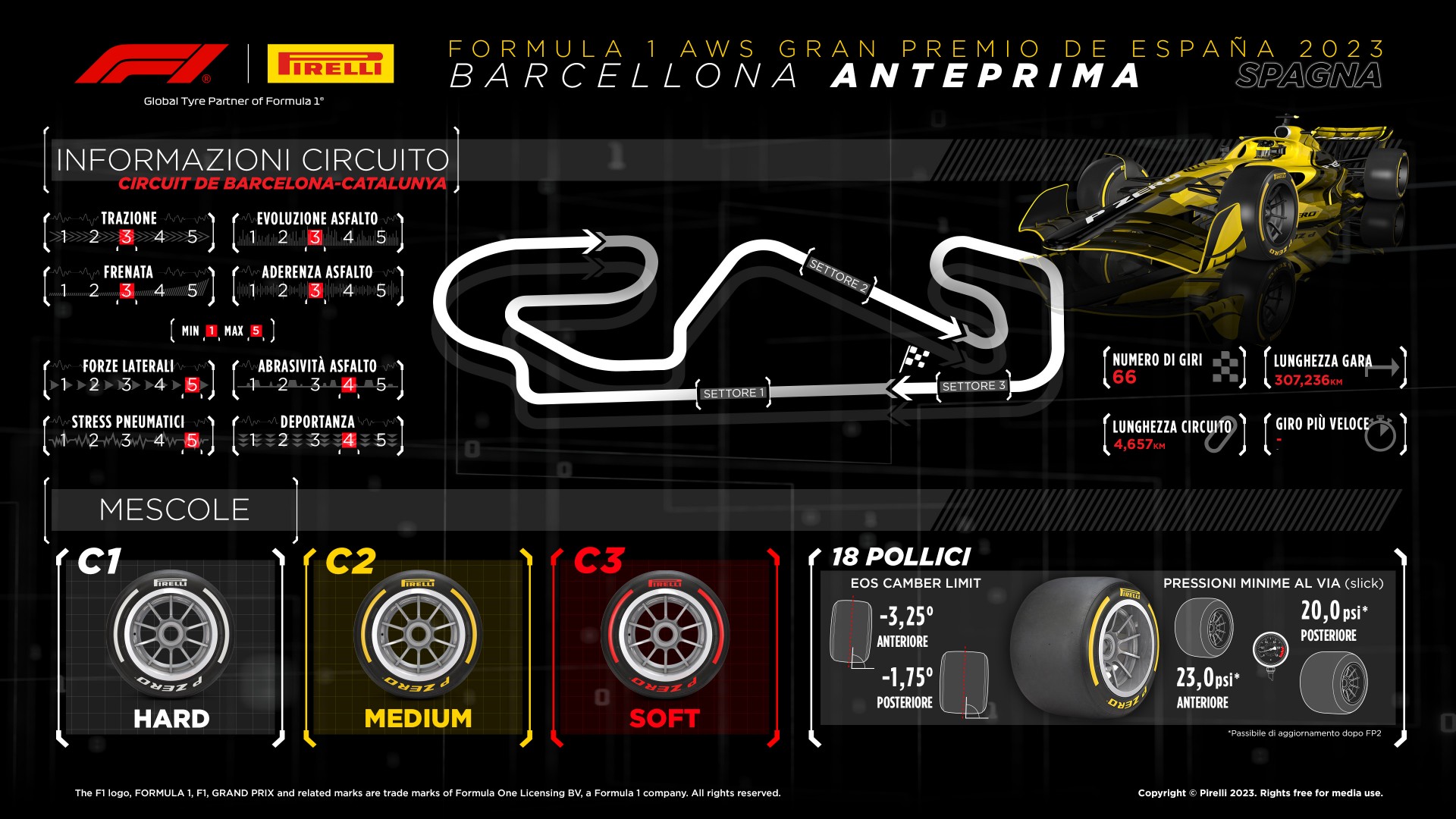 Per il GP di Spagna Pirelli ha messo a disposizione di team e piloti Hard C1, Medium C2 e Soft C3, optando dunque per dei compound duri tra i quali spicca quello della C1, la nuova mescola introdotta quest’anno per mitigare le differenze tra le mescole più dure della gamma 2022. “Tradizionalmente, il Circuit di Barcelona-Catalunya è uno dei più probanti della stagione, sia per quanto riguarda le vetture che i pneumatici. È un tracciato completo, che presenta tipologie di curve a diverse velocità e ha anche un rettilineo molto lungo: l’efficienza aerodinamica è la chiave per essere competitivi ai massimi livelli” – ha dichiarato Mario Isola, Direttore Motorsport di Pirelli – “Quest’anno è stato modificato il terzo settore, ritornando al layout originale con l’eliminazione dell’ultima chicane, rendendolo molto più filante e aumentando anche la velocità d’entrata sul rettilineo principale. La pista ha due curve, la 3 e la 9, che sono particolarmente impegnative in termini di forze laterali esercitate sulle gomme. Dal punto di vista della scelta delle mescole, abbiamo optato per un tris uguale a quello utilizzato in Bahrain all’inizio del campionato. Sebbene la nomenclatura sia identica a quella del 2022, va considerato che la C1 di quest’anno è una mescola nuova, sviluppata appositamente per ridurre il divario fra la gomma più dura (oggi denominata C0) e la C2. Sulla carta questa scelta dovrebbe ampliare le opzioni a disposizione delle squadre in vista della gara, considerato che l’anno scorso la Hard non fu utilizzata da nessun pilota. Un’altra novità di questo fine settimana riguarda la possibilità data a tutti i piloti di provare nelle prime due sessioni di prove libere due treni di Hard supplementari con la costruzione che sarà introdotta a partire dal Gran Premio di Gran Bretagna. La nuova specifica differisce da quella attuale solamente per l’utilizzo di un materiale, già omologato dopo un intenso lavoro di test. La sua introduzione, prevista per il 2024, è stata anticipata al fine di rendere la struttura più resistente alla fatica, visto che il livello di carichi generati dalle vetture attuali ha già raggiunto dopo poche gare i target previsti per la fine della stagione. Le nuove costruzioni non modificano i parametri tecnici né le prestazioni delle gomme. Infine, il lavoro di Pirelli sulla pista di Barcellona proseguirà anche all’inizio della prossima settimana con due giorni di test, realizzati in collaborazione con Mercedes e Ferrari, dedicati allo sviluppo delle mescole e delle costruzioni per il 2024”. Stando alle previsioni meteo, Intermedie e Full Wet potrebbero tornare a giocare un ruolo da protagoniste nella giornata di domenica: se al venerdì e al sabato è infatti previsto un clima primaverile, nel giorno della gara sono previste precipitazioni sparse nei dintorni di Barcellona.