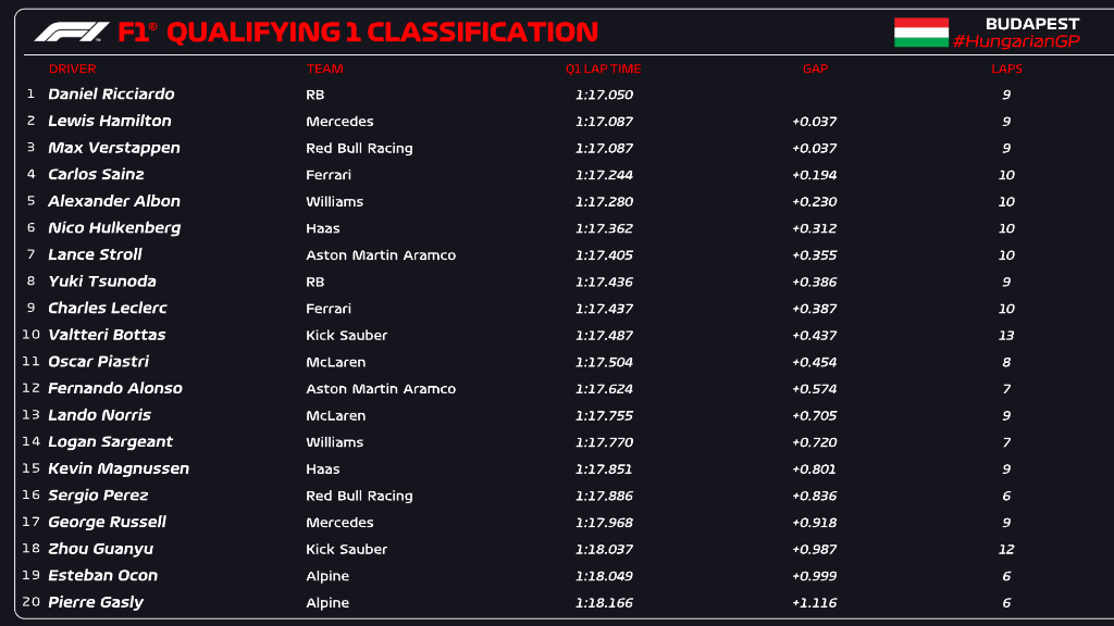 Qualifiche GP Ungheria 2024: la classifica della Q1