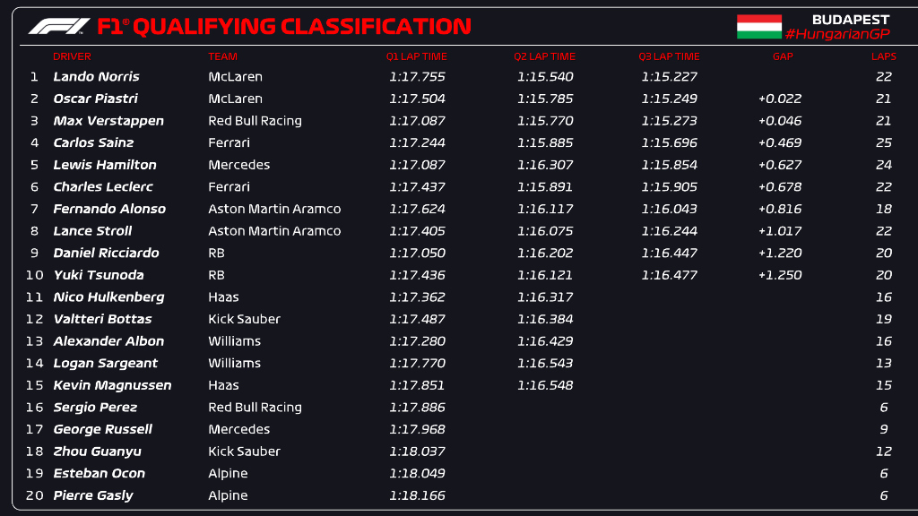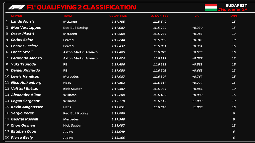 Qualifiche GP Ungheria 2024: la classifica della Q2