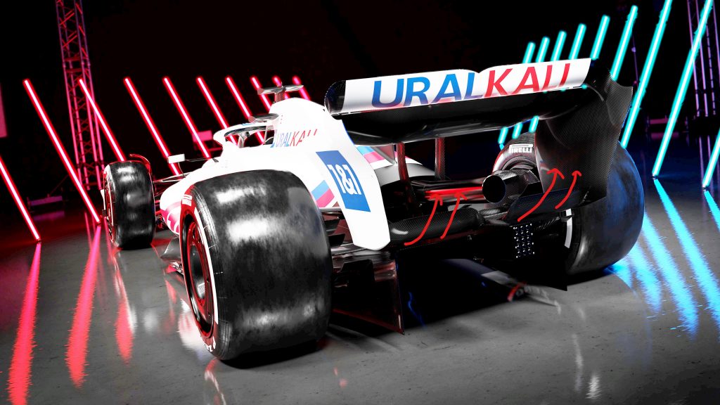 Il render mostrato dalla Haas presenta uno schema sospensivo simile a quello 2021, con la sospensione anteriore che rimane push-rod, diversamente da quanto probabilmente vedremo su altri team (cc: McLaren). Il triangolo inferiore si connette al centro del portamozzo in modo da lasciare libera la zona davanti all’ingresso del fondo. Probabilmente però non sapremo come sarà la versione definitiva fino ai primi test invernali.