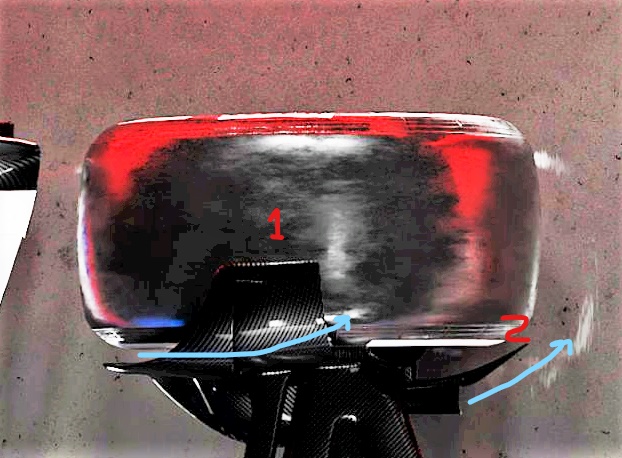 Dopo l’eliminazione dei bargeboard e del vortice y250, il regolamento ha voluto essere magnanimo con le squadre e ha concesso loro di aggiungere degli elementi aerodinamici nella parte interna della ruota (volumi RV-FWH-SCO e RS-FWH-DRUM del regolamento tecnico) per impedire all’aria sporca generata dal rotolamento delle ruote di essere ingerita dal fondo. Possiamo notare infatti come sia l’elemento 1 che l’elemento 2 dell’immagine puntino verso l’esterno in modo da spingere la scia della ruota lontano dal fondo vettura. Il vantaggio di avere “aria pulita” diretta verso il fondo non è solo quello di generare più carico, ma di generare un quantitativo di downforce costante e prevedibile. La scia prodotta dalle ruote anteriori è infatti altamente turbolenta e variabile nel tempo e qualora venisse ingerita dal fondo il carico generato sarebbe anch’esso oscillante e imprevedibile.