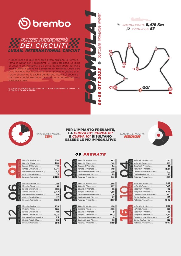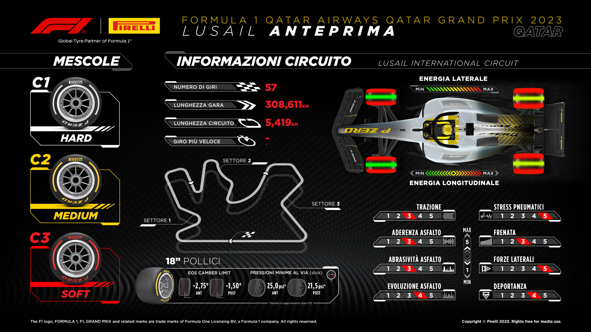 Pirelli per questo GP ha deciso di mettere a disposizione di team e piloti le Hard C1, le Medium C2 e le Soft C3. “La Formula 1 torna in Qatar a due anni di distanza dal debutto, avvenuto nel 2021. In un certo senso, quello in programma nel fine settimana è quasi un esordio, sia perché le monoposto attuali sono molto diverse da quelle utilizzate due anni fa, sia perché il tracciato di Losail è stato completamente riasfaltato, così come sono stati modificati i cordoli” – ha commentato Mario Isola, Direttore Motorsport di Pirelli – “Sulla carta le caratteristiche della pista sono rimaste inalterate, ma è chiaro che le modifiche intervenute in questi due anni rendono relativamente significativi i dati raccolti nella prima edizione di questo Gran Premio. In termini di severità per i pneumatici, quello di Losail è un circuito molto impegnativo, paragonabile a Silverstone e Suzuka: non è una coincidenza che il tris di mescole scelto per questa gara sia lo stesso, vale a dire C1-C2-C3. Ci sono diverse tipologie di curve, la maggior parte a media e alta velocità. La serie di curve fra la 12 e la 14 ricorda abbastanza la curva 8 del circuito di Istanbul, una delle più impegnative per le gomme della storia recente della Formula 1, ed è uno dei punti determinanti per ottenere un buon tempo sul giro. Il fatto che ben undici delle 16 curve siano a destra sollecita particolarmente il lato sinistro della monoposto, soprattutto l’angolo anteriore, ma i livelli di energia registrati sulle gomme nel 2021 risultarono comunque abbastanza ben bilanciati fra i due assi. A rendere il Gran Premio del Qatar ancor più sfidante per noi, le squadre e i piloti, sarà il fatto che questo fine settimana vedrà il ritorno del formato Sprint. Ci sarà quindi solamente un’ora di prove libere a disposizione il venerdì per decidere l’assetto e valutare il comportamento dei pneumatici sulla lunga distanza, per di più in programma quando ci sarà ancora il sole a riscaldare l’asfalto mentre la qualifica e le due gare si disputeranno in notturna. Ci sono quindi tutti gli elementi per assistere ad un weekend interessante e, chissà, foriero di qualche sorpresa: chi saprà adattarsi meglio e in fretta alla pista potrebbe acquisire un vantaggio importante”. Pirelli ha ovviamente portato con sé anche Intermedie e Full Wet, ma ovviamente le coperture da bagnato non verranno utilizzate in Qatar: le previsioni meteo parlano infatti di un weekend privo di precipitazioni, con temperature medie che oscilleranno attorno ai 38°.