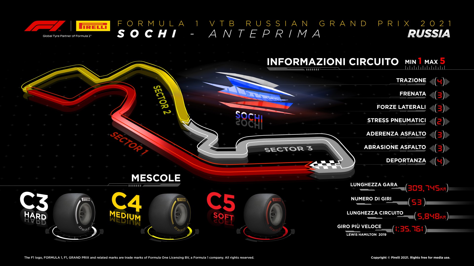 Pirelli ha deciso di mettere a disposizione di team e piloti i compound più morbidi della gamma. In Russia potranno dunque essere utilizzate – oltre alle sempre presenti Intermedie e Full Wet – le Hard C3, le Medium C4 e le Soft C5. “Negli anni passati abbiamo assistito ad una bella varietà di strategie, con tutte e tre le mescole sulla griglia di partenza e diverse tattiche attuate durante il gran premio” – ha detto Mario Isola – “L’anno scorso, la Soft C5 ha ottenuto risultati migliori del previsto e i livelli di graining di tutte le mescole si sono gradualmente ridotti tra le prove libere e la gara, grazie all’elevata evoluzione della pista. È anche capitato che alcuni piloti passassero con largo anticipo alla mescola più dura tentando di usarla fino alla fine, ma l’anno scorso questo non è stato possibile perché negli anni l’asfalto è andato via via maturando e non è più liscio come un tempo. Grazie alla gomma che si depositerà con il succedersi delle numerose gare di questo weekend, l’evoluzione della pista e il grip dovrebbero essere ulteriormente migliorati”. Per quanto riguarda infine il meteo, Giove Pluvio potrebbe decidere di mettere il proprio zampino anche in questo fine settimana: il sole dovrebbe infatti splendere su Sochi solamente nella giornata di venerdì, con possibili piogge a lambire invece il circuito nelle giornate di sabato e domenica.