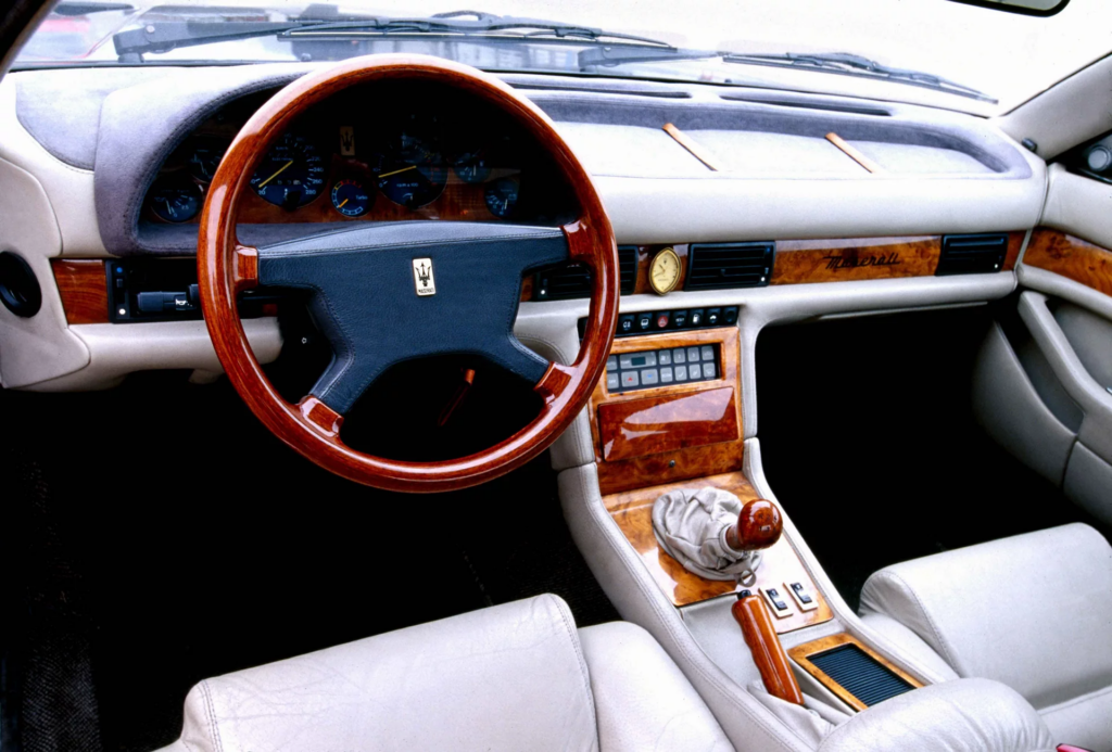 E veniamo ad uno degli aspetti più controversi, ovvero la linea. Qualcuno dice che sembri una Spyder con l’hard top, in realtà vorrebbe prenderne le distanze ma forse lo fa in maniera troppo lieve. Il risultato non convince appieno, risultando divisivo nel pubblico che non apprezza il tetto, accusato di non superare il centro della ruota posteriore. All’interno la casa modenese trasporta tutto il meglio della 430, ovvero il top di gamma della Biturbo, proponendo un interno rivestito in pelle e radica. Queste finiture di lusso danno un effetto forse un po’ barocco all’interno ma contribuiscono alla sensazione di un “salottino italiano” che da sempre ha accompagnato la Biturbo in tutte le sue declinazioni. L’orologio dorato di forma ellittica fa bella mostra di sé al centro della plancia, subito sopra alla console del climatizzatore automatico, vera chicca per l’epoca che ancora non lo vedeva diffusissimo come al giorno d’oggi. Il volante in radica fa il paio con la leva del cambio, totalmente rivestita in radica e con la prima in basso. Già, perché il cambio viene ripreso pari pari dalla Biturbo, confermando lo storico ZF a 5 marce, purtroppo non esente da impuntamenti.
