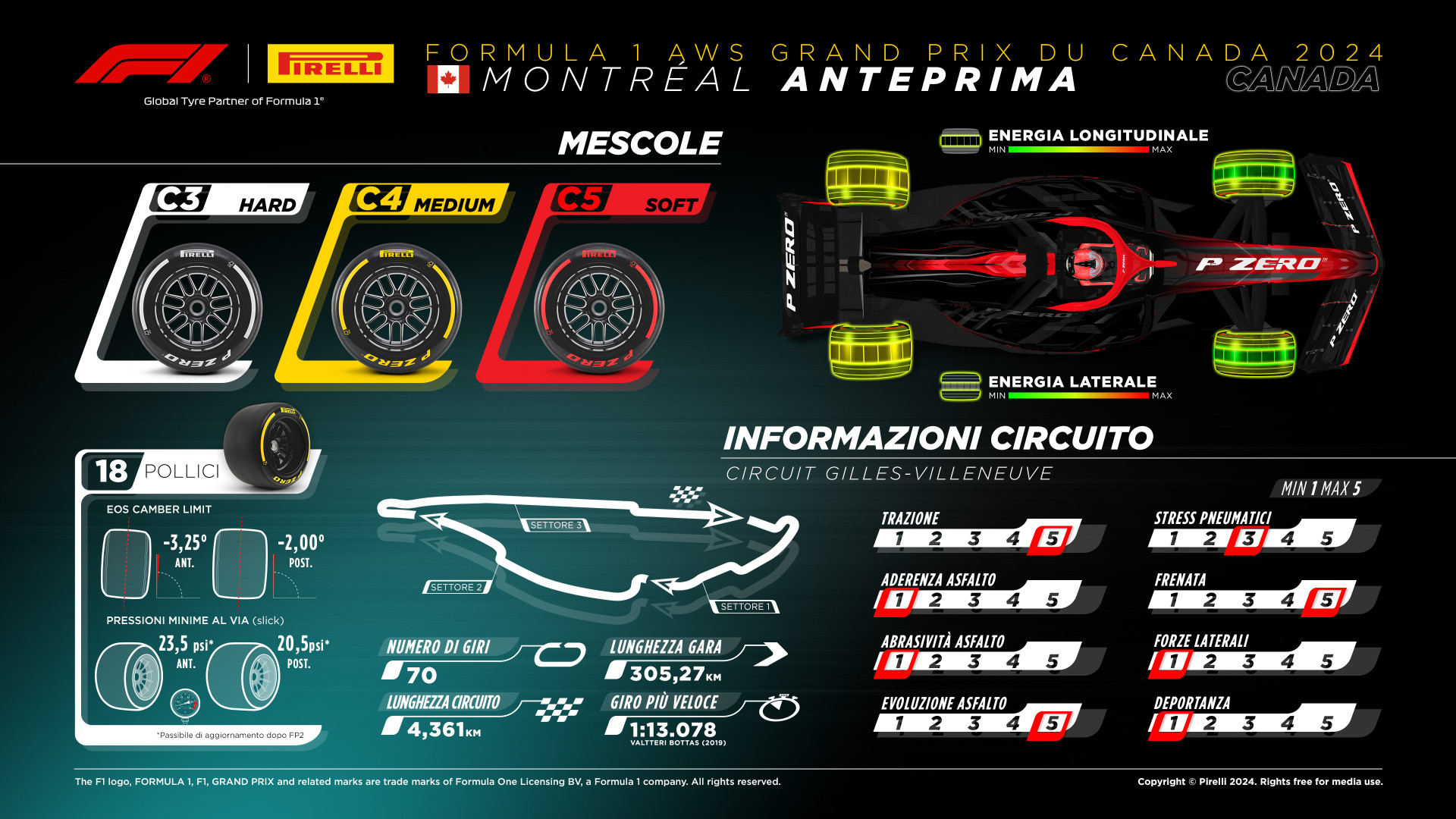 Pirelli per il Gran Premio del Canada ha messo a disposizione di team e piloti le Hard C3, le Medium C4 e le Soft C5, le mescole già viste in azione nei weekend di Miami e Monte Carlo nonché i compound più morbidi dell’intera gamma. Il fornitore milanese sul tracciato di Montreal sarà chiamato ad affrontare una sfida in parte inedita, dovendo vedersela con tutte le incognite legate alla presenza di un nuovo asfalto e di nuovi cordoli. Si prevede che il rinnovato manto del circuito canadese – destinato peraltro ad avere una grande evoluzione nel corso del weekend – possa far registrare bassi valori di aderenza e abrasività, con gli pneumatici che subiranno forti sollecitazioni soprattutto sull’asse longitudinale per via delle continue frenate e ripartenze. Ovviamente presenti saranno anche le solite Intermedie e Full Wet che, stando a quanto sostiene il meteo nel momento in cui viene scritto l’articolo, potrebbero dover essere utilizzate parecchio nell’arco del weekend: le previsioni parlano infatti di rovesci di pioggia in tutti e tre i giorni del fine settimana, con temperature medie nell’ordine dei 20°.