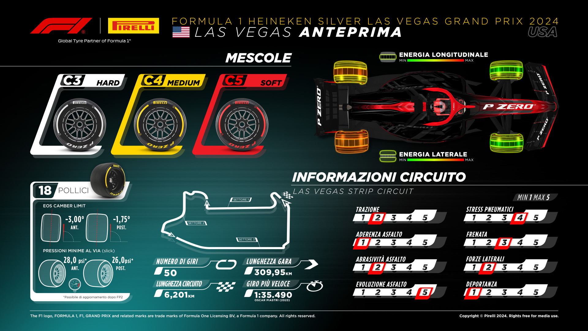In occasione del GP di Las Vegas Pirelli ha messo a disposizione di team e piloti le Hard C3, le Medium C4 e le Soft C5, vale a dire le mescole più morbide dell’intera gamma. Il fornitore milanese mette in guardia dalle basse temperature notturne tipiche del deserto del Mojave, definendo di cruciale importanza il warm-up dell’asse anteriore. Quest’ultimo sarà infatti fondamentale tanto in fase di inserimento quanto in fase di frenata: dato il prevedibile ulteriore abbassamento della temperatura superficiale degli pneumatici in corrispondenza dei lunghissimi rettilinei di Las Vegas, infatti, non sarà raro incappare in fastidiosi bloccaggi. In un fine settimana durante il quale sarà enorme anche l’evoluzione del tracciato, Pirelli ha ovviamente portato con sé anche le onnipresenti Intermedie e Full Wet. Le coperture da bagnato, tuttavia, dovrebbero poter dormire sonni tranquilli: nel momento in cui viene scritto l’articolo le previsioni meteo parlano di un cielo sereno per tutto l’arco del weekend, con le sole basse temperature notturne a rappresentare la vera incognita climatica.