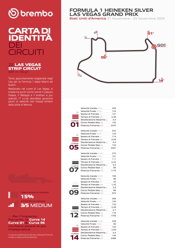 Il tracciato cittadino del Nevada si è infatti meritato un indice di difficoltà pari a 3 nella scala da 1 a 5 utilizzata dal fornitore italiano, secondo il quale i piloti di F1 utilizzeranno pinze e dischi solamente per 7”2 al giro, pari al 15% del tempo complessivo di gara. La staccata più impegnativa per l’impianto frenante sarà quella di Curva 14: lì le monoposto passeranno da 329 km/h a 95 km/h percorrendo 130 m in 2”59, mentre i piloti eserciteranno 140 kg di pressione sul pedale del freno e subiranno una decelerazione massima di 4,4 G.