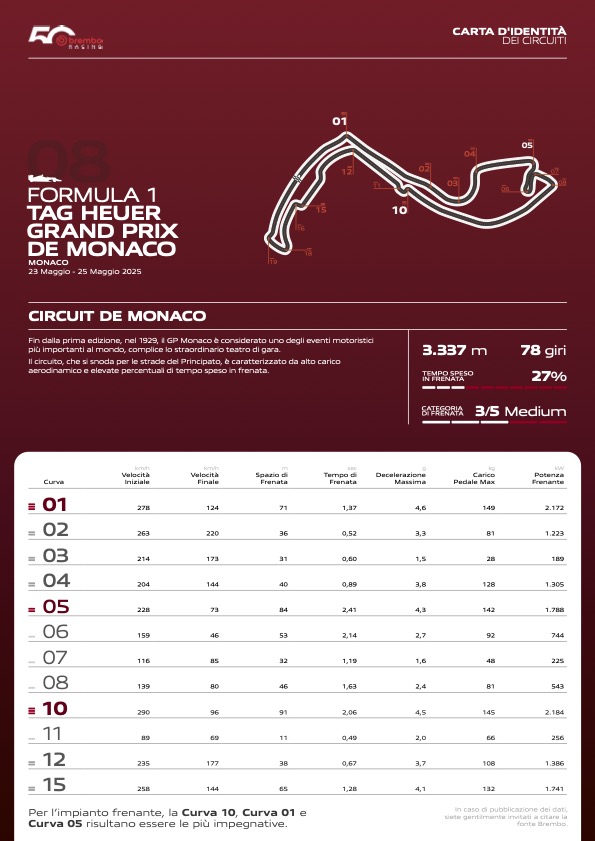Secondo i dati forniti da Brembo quello di Monaco è un circuito mediamente impegnativo per l’impianto frenante, con un indice di difficoltà pari a 3 in una scala che va da 1 a 5. I piloti trascorreranno il 19% del tempo totale di gara con il pedale del freno pigiato, e sarà la Chicane del Tunnel la staccata più impegnativa: lì infatti i piloti passeranno da 290 km/h a 96 km/h, percorrendo 91 m in 2”06, esercitando 145 kg di carico sul pedale del freno e subendo una decelerazione pari a 4,5 G.