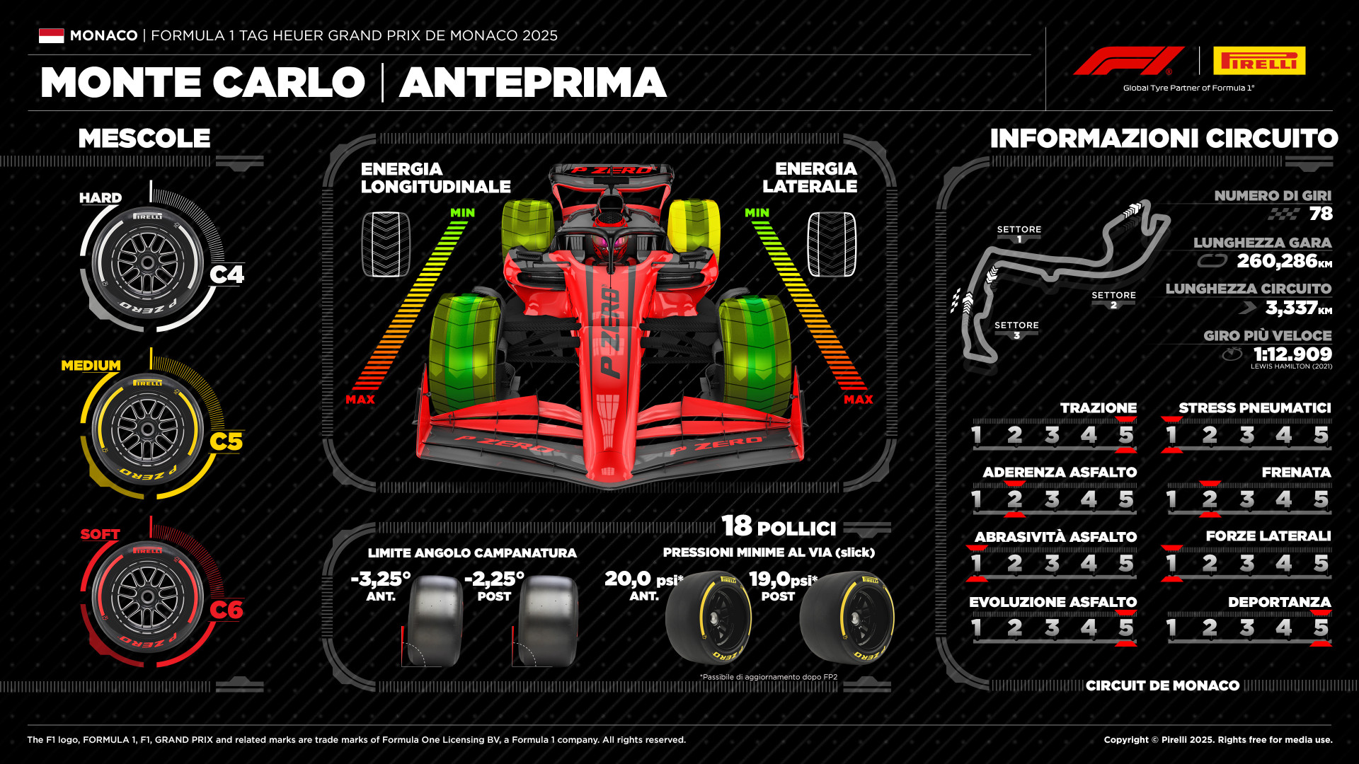 Pirelli, come sempre quando il Circus giunge tra le stradine del Principato, ha messo a disposizione di team e piloti le mescole più morbide della propria gamma, vale a dire Hard C4, Medium C5 e Soft C6. Su una pista che non espone gli pneumatici a elevate forze laterali è la trazione a giocare un ruolo fondamentale: cruciale per le squadre sarà trovare il giusto set up su una pista destinata a evolversi moltissimo nel corso del weekend, data la presenza di tutte le serie di supporto del caso.