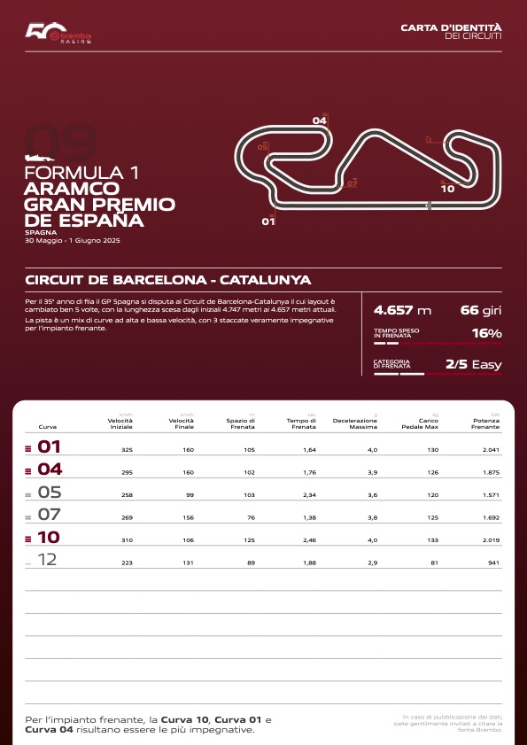 Secondo i dati forniti da Brembo, il Circuit de Catalunya rientra tra quelli scarsamente impegnativi per i freni. L’impianto del Montmelò si è infatti guadagnato un indice di difficoltà pari a 2 in una scala che va da a 1 a 5, con i piloti che ricorrono a pinze e dischi solamente per il 16% del tempo complessivo di gara. La staccata più impegnativa del tracciato catalano è quella di Curva 10: lì i piloti passeranno da 310 km/h a 106 km/h, percorrendo 125 m in 2”46, esercitando 133 kg di carico sul pedale del freno e subendo una decelerazione di 4 G. Il record sul giro in gara con questa configurazione del tracciato appartiene a Max Verstappen, che nel 2023 ha fermato il cronometro sull’1’16”330, ed è stato sempre l’olandese a vincere la passata edizione andando a precedere al traguardo la McLaren di Lando Norris e la Mercedes di Lewis Hamilton.