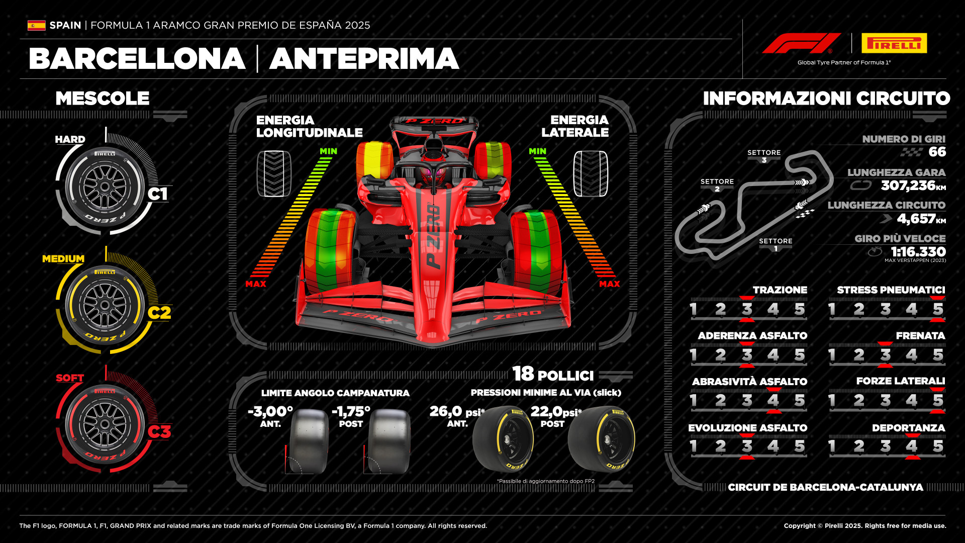 In occasione del Gran Premio di Spagna di Formula 1 Pirelli ha messo a disposizione di team e piloti le Hard C1, le Medium C2 e le Soft C3, scegliendo quindi i tre compound più duri della propria gamma dopo due weekend di gara consecutivi caratterizzati invece dall’utilizzo delle mescole più morbide. Ovviamente presenti saranno anche le immancabili Intermedie e Full Wet, che però dovrebbero poter dormire sonni tranquilli: nel momento in cui viene scritto l’articolo il meteo parla di un clima soleggiato per tutto l’arco del weekend, con temperature medie nell’ordine dei 26°.