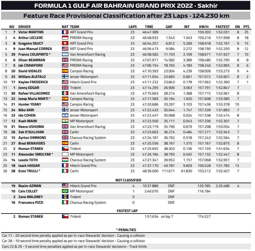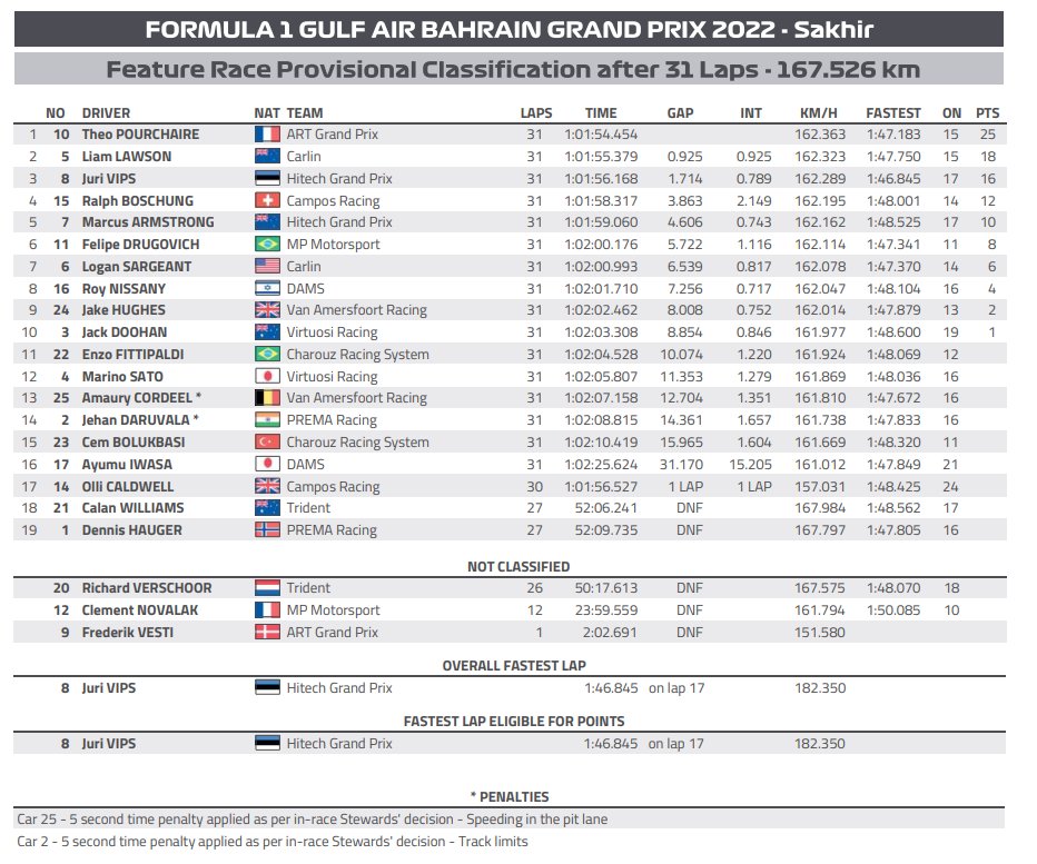 Il weekend del Bahrain c’ha permesso di poter intravedere quali saranno i valori di forza per il resto della stagione, e, accanto a ragazzi già maturi, abbiamo potuto individuare nuovi piloti pronti a dare battaglia: in Formula 2 appartiene sicuramente alla prima categoria Theo Pourchaire, pilota maturo e pronto per vincere il titolo e per effettuare il grande salto, e in questo weekend ne ha dato piena dimostrazione: secondo in qualifica, in gara 1 stava risalendo bene, prima che un guasto meccanico lo fermasse; il francese non si è dato per vinto, e, nonostante una pessima partenza in gara 2, è riuscito a vincere la sua terza gara nella categoria, portandosi adesso al comando della classifica con 25 lunghezze. Lo segue ad un solo punto di distacco Liam Lawson, forse il migliore del weekend, che è riuscito a conquistare un terzo posto nella Sprint Race e un secondo posto nella Feature. Bene anche Vips, terzo, e Boschung, quarto, con il primo che può giustamente recriminare i problemi al cambio gomme, mentre il secondo è riuscito a mettere una pezza alla poca competitività della Campos con due partenze magistrali, anche se poi è arretrato in classifica. Tra i rookie, chi ha ben figurato, ma forse non pienamente convinto, è stato Jack Doohan (che rookie non è, avendo corso gli ultimi due round del 2021): il pilota australiano ha conquistato la pole al venerdì, ma in gara 1 non è riuscito a terminare a punti, risucchiato dal gruppo nella seconda parte di corsa (forse ha spremuto troppo le gomme), mentre in gara 2 era in lotta per la vittoria, prima che una toccata con Pourchaire all’uscita dai box lo costringesse a rientrare di nuovo per sostituire l’ala. Il figlio di Mick ha chiuso solo decimo, sfruttando i ritiri davanti a lui. Chi invece ha avuto un weekend opposto (male in qualifica, bene in gara) è sicuramente Ayumu Iwasa; il nipponico prima della tappa bahrenita era un oggetto misterioso, e in qualifica non era riuscito ad andare oltre l’ultima posizione, senza aver effettuato neanche un giro cronometrato, ma in gara è diventato un vero e proprio animale, rimontando in entrambe le corse con sorpassi incredibili: nella prima corsa ha chiuso all’ottavo posto, conquistando un punto, mentre in gara 2, dopo essere stato anche al comando per la girandola dei pit stop, era comodamente in zona punti, prima che alla ripartenza all’ultimo giro si girasse (forse per un contatto), finendo sedicesimo. Il giovane pilota della Red Bull ha comunque fatto una prestazione sontuosa, e adesso lo attendiamo a Jeddah per vedere se si confermerà. Chi invece per ora è rimandato è Dennis Hauger, il campione uscente della F3, mai veramente in palla sia in qualifica che in gara, al di là del ritiro sopracitato. Il norvegese della Red Bull (ma a proposito, quante livree Red Bull ci sono? Uno come fa a distinguere i piloti?) ha tutte le qualità per emergere, e ci aspettiamo che sia lui, sia la Prema (questo weekend stranamente sottotono) possano risalire la china. Da segnalare, infine, la vittoria di Richard Verschoor in gara 1, con l’olandese che ha portato alla Trident la prima vittoria nella categoria da quando Luca Ghiotto si impose a Sepang nel 2016.
