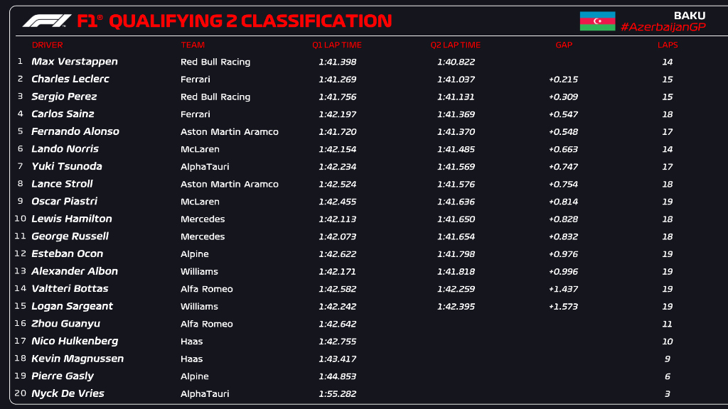 La seconda manche delle qualifiche, a differenza della interminabile Q1, scorre via senza particolari colpi di scena o interruzioni. Al termine di questa fase centrale è la Red Bull a fare la voce grossa, con Max Verstappen che ferma il cronometro sull’1’40”822 rifilando così 215 millesimi a Charles Leclerc e poco più di tre decimi a Sergio Perez, 3° davanti alla Ferrari di Carlos Sainz. Fernando Alonso porta la sua Aston Martin in 5ª piazza, andando così a precedere gli ottimi Norris e Tsunoda e Lance Stroll, 8° davanti a Oscar Piastri e a Lewis Hamilton. Il #44 della Mercedes accede all’ultima manche delle qualifiche solamente per 4 millesimi di secondo: tanto è infatti il distacco che separa l’inglese dal connazionale – nonché compagno di squadra – George Russell, clamorosamente primo degli esclusi di questo Q2. Alle spalle del #63 si piazzano poi Esteban Ocon, Alexander Albon, Valtteri Bottas e Logan Sargeant, 15° a oltre 1”5 di distanza dalla vetta della classifica.