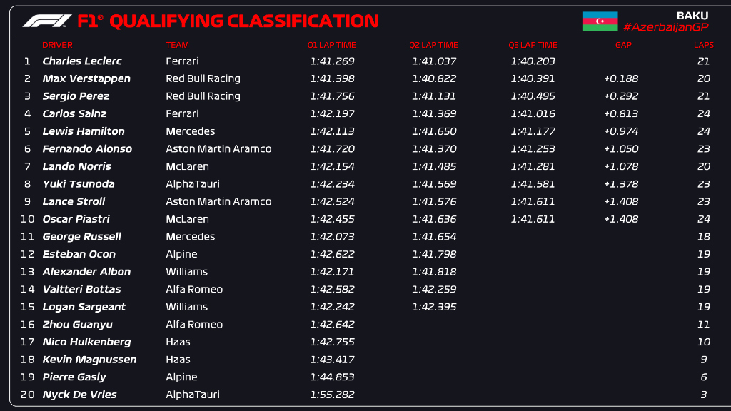 La terza e decisiva manche delle qualifiche del Gran Premio dell’Azerbaijan si apre con un crono identico al millesimo tanto per Max Verstappen quanto per Charles Leclerc: entrambi stampano infatti un 1’40”445 che però, essendo stato messo a segno prima dall’olandese, vale proprio al #1 la pole position provvisoria. Il #16 e la sua Ferrari SF-23 sembrano tuttavia essere in stato di grazia tra i muretti e i cordoli di Baku e, sfruttando in maniera perfetta un nuovo set di Soft, grazie a un giro praticamente perfetto strappano dalle mani di Max Verstappen la pole position del GP dell’Azerbaijan. Il #16 ferma infatti il cronometro sull’1’40”203, staccando così di 188 millesimi il #1 della Red Bull e di poco meno di tre decimi Sergio Perez, 3° davanti a un Carlos Sainz che continua a essere in difficoltà sull’asfalto di Baku e non va oltre la 4ª posizione accusando 813 millesimi di ritardo dal compagno di squadra. 5° è Hamilton, che con un colpo di reni si issa davanti a Fernando Alonso e a Lando Norris, mentre Yuki Tsunoda con un’ottima prestazione si toglie la soddisfazione di mettersi alle spalle Lance Stroll e Oscar Piastri, comunque buon 10° con una McLaren che sta iniziando a mostrare segnali di crescita.