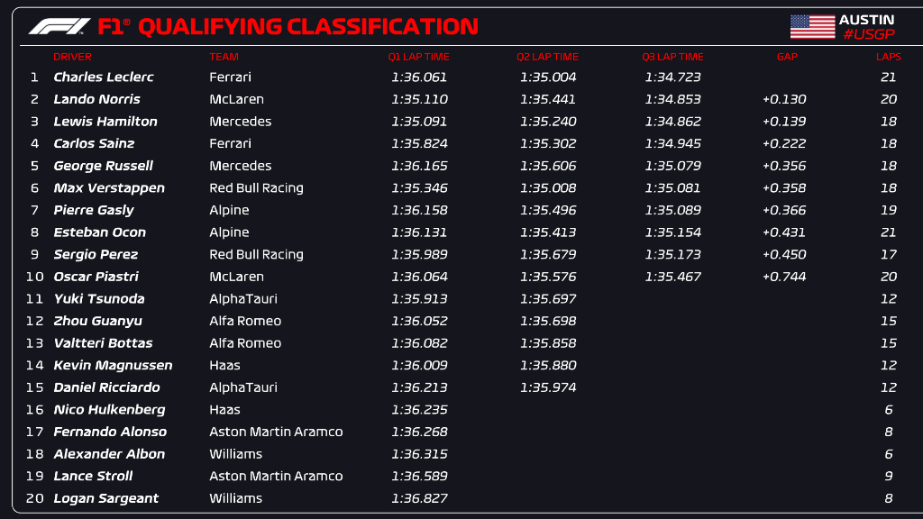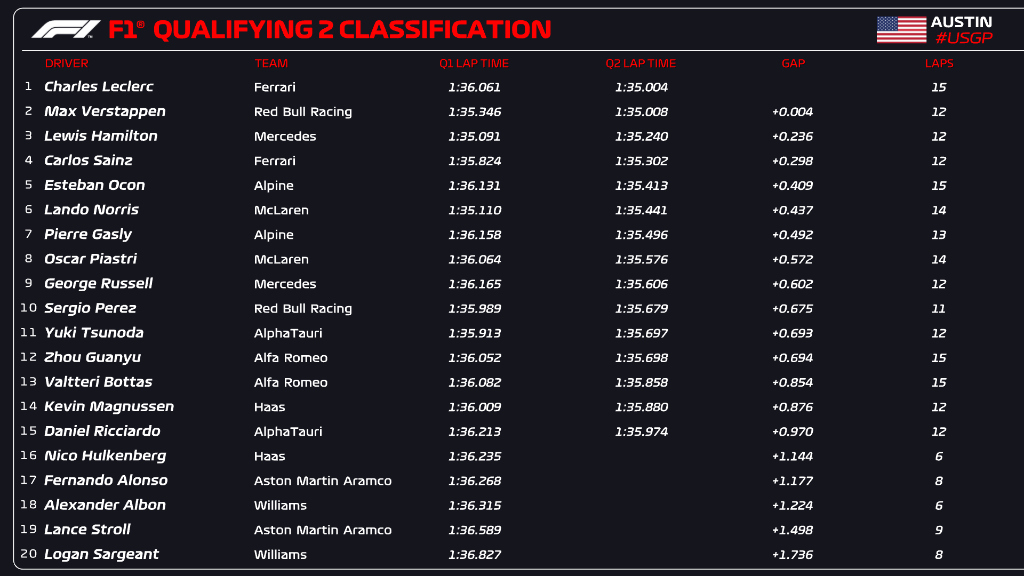 È invece Charles Leclerc a dettare il passo nella Q2. Il monegasco della Ferrari chiude davanti a tutti grazie al suo 1’35”004, con Max Verstappen a inseguire staccato di appena 4 millesimi e con Lewis Hamilton che si piazza invece 3° con quasi due decimi e mezzo di ritardo. 4ª posizione per Carlos Sainz, mentre Esteban Ocon precede Lando Norris, Pierre Gasly e Oscar Piastri, 8° a 572 millesimi di ritardo dal crono di Leclerc. Nella seconda manche delle qualifiche del GP degli Stati Uniti rischiano sia George Russell che Sergio Perez, rispettivamente 9° e 10° allo sventolare della bandiera a scacchi, e mastica invece amaro Yuki Tsunoda: il giapponese, primo degli esclusi, manca l’approdo al decisivo Q3 per soli 18 millesimi. Alle spalle del #22 si piazzano le Alfa Romeo di Guanyu Zhou e Valtteri Bottas, la Haas di Kevin Magnussen e l’AlphaTauri di Daniel Ricciardo, 15° alla prima qualifica dopo l’infortunio patito nel weekend del GP d’Olanda.