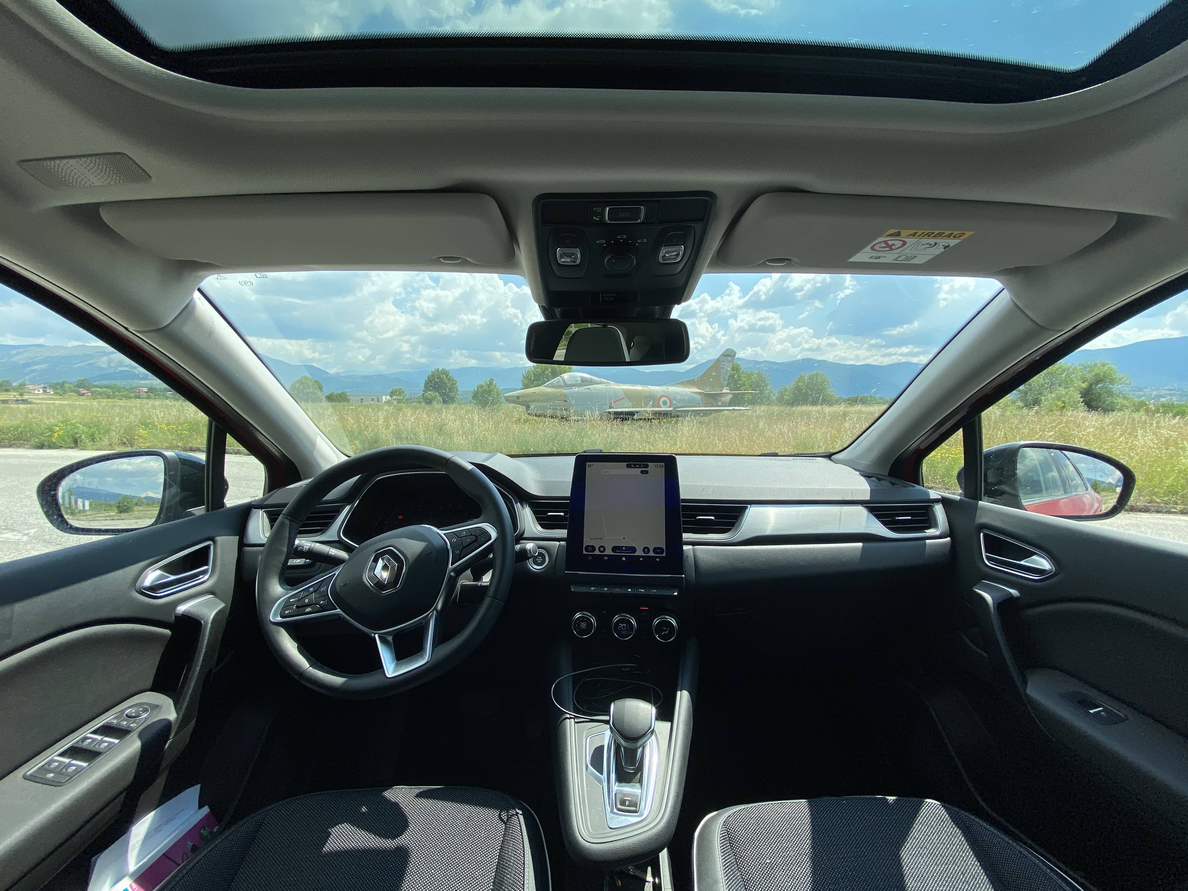 Tanti cambiamenti li ho trovati anche nell’abitacolo, che grazie al tetto panoramico in vetro – optional ed azionabile elettricamente – è clamorosamente luminoso. Comodi e sufficientemente contenitivi sedili in tessuto con inserti in pelle accolgono tutti gli occupanti, e si nota in fretta come anche la plancia abbia goduto di un trattamento svecchiante. Schermi da 10″2 per il sistema di infotainment e da 7″ per il quadro strumenti modernizzano gli interni di una Renault Captur dal design interno piacevole: sopravvivono pochi pulsanti fisici, le linee sono pulite ed i materiali della parte superiore sono di discreta qualità. Lo stesso non può tuttavia dirsi né per la parte inferiore dell’abitacolo – dove la plastica è troppo rigida – né per la scenografica Flying Console: accattivante, pensata per ospitare la leva del cambio EDC ed utilissima per ricavare uno dei numerosi vani portaoggetti al di sotto di essa, ha un gioco piuttosto evidente e non trasmette una sensazione di estrema solidità. Qualcosa di più si sarebbe potuto fare anche per quanto riguarda il “cassettino” del passeggero: sprovvisto di soffietto ed anche lui poco…inamovibile, paga una grande capienza con un discreto ingombro, non offrendo oltretutto un rivestimento interno neppure sull’allestimento Intens.