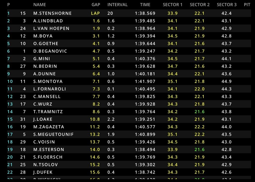 Alla ripartenza, con quattro giri rimanenti, Stenshorne scatta e spiazza Lindblad che si ritrova a dover gestire la pressione di Van Hoepen in piena rimonta. Beganovic, con una serie di sorpassi magistrali, risale fino all’ottava posizione.
