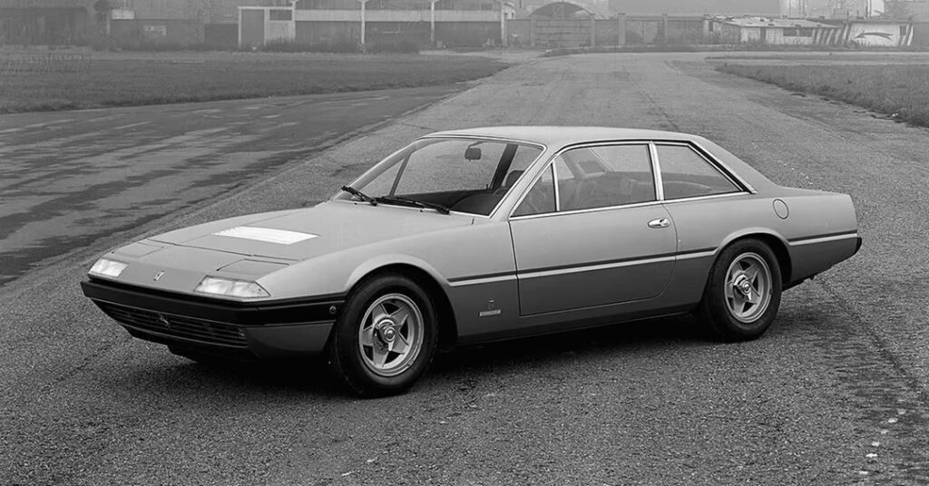 Quando si parla delle granturismo Ferrari è facile perdere la bussola, data la quantità decisamente impegnativa di modelli leggendari prodotti dalla casa di Maranello. Nel 1971 la gamma vede la Ferrari presidiare il segmento con la 365GT 2+2, nata nel 1967 e ancora legata a degli stilemi che stanno invecchiando rapidamente. Ferrari si rivolge, come tradizione di quegli anni, a Pininfarina che confeziona per la nuova vettura un abito che riprende i canoni stilistici che si stanno prendendo piede in quel decennio, fatti di linee tese e aerodinamiche.