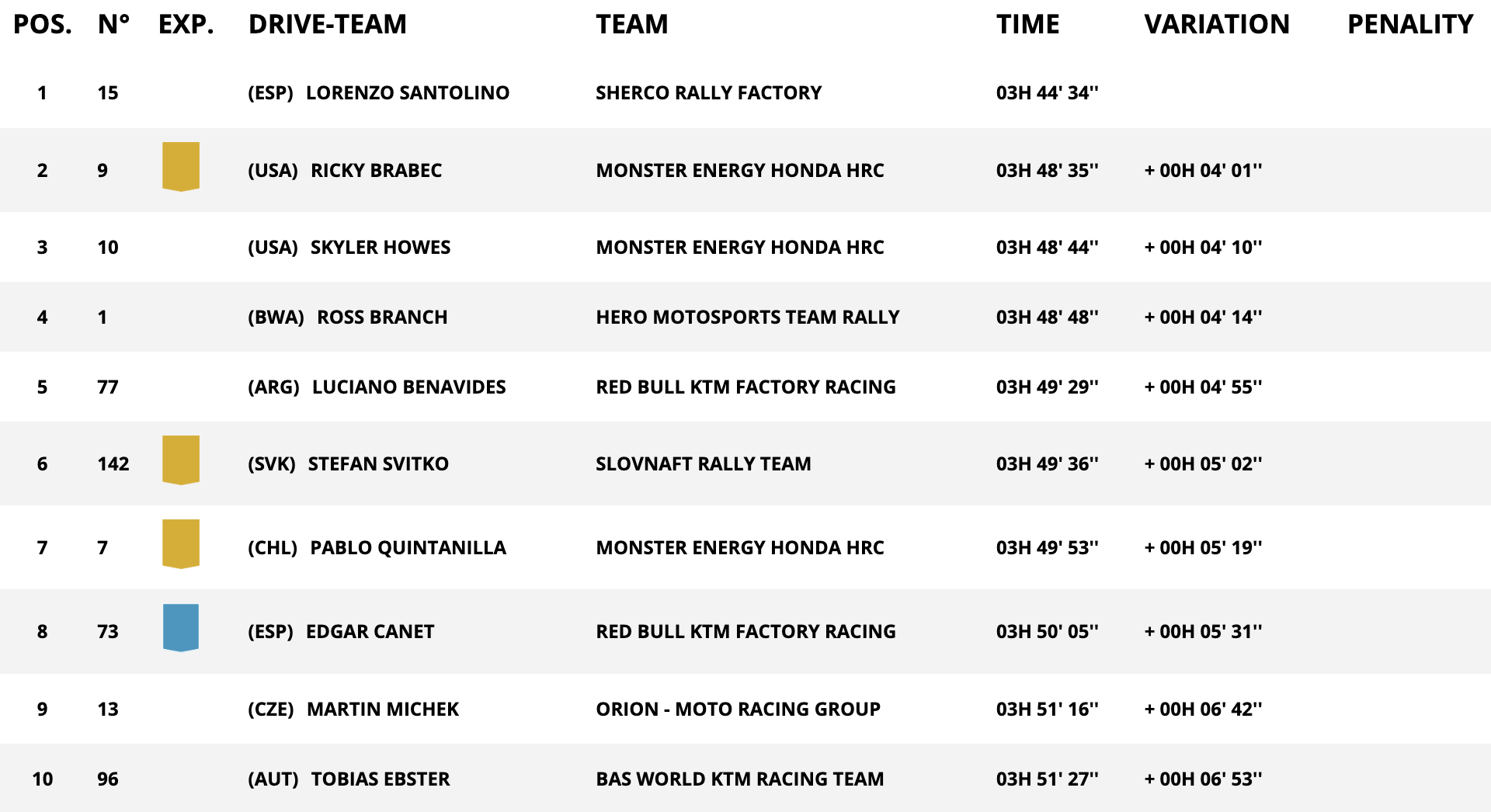 E Daniel Sanders? 21°, a 14’49” di ritardo dal crono di Santolino. L’alfiere di KTM ha vissuto una giornata complicata dal punto di vista della navigazione, incontrando diverse difficoltà sin dai primi km della sezione cronometrata, ed è solamente grazie agli oltre 4’ di abbuono concessigli dalla direzione gara per avere di nuovo fatto da apripista che è riuscito a rimanere davanti a tutti nella classifica generale.