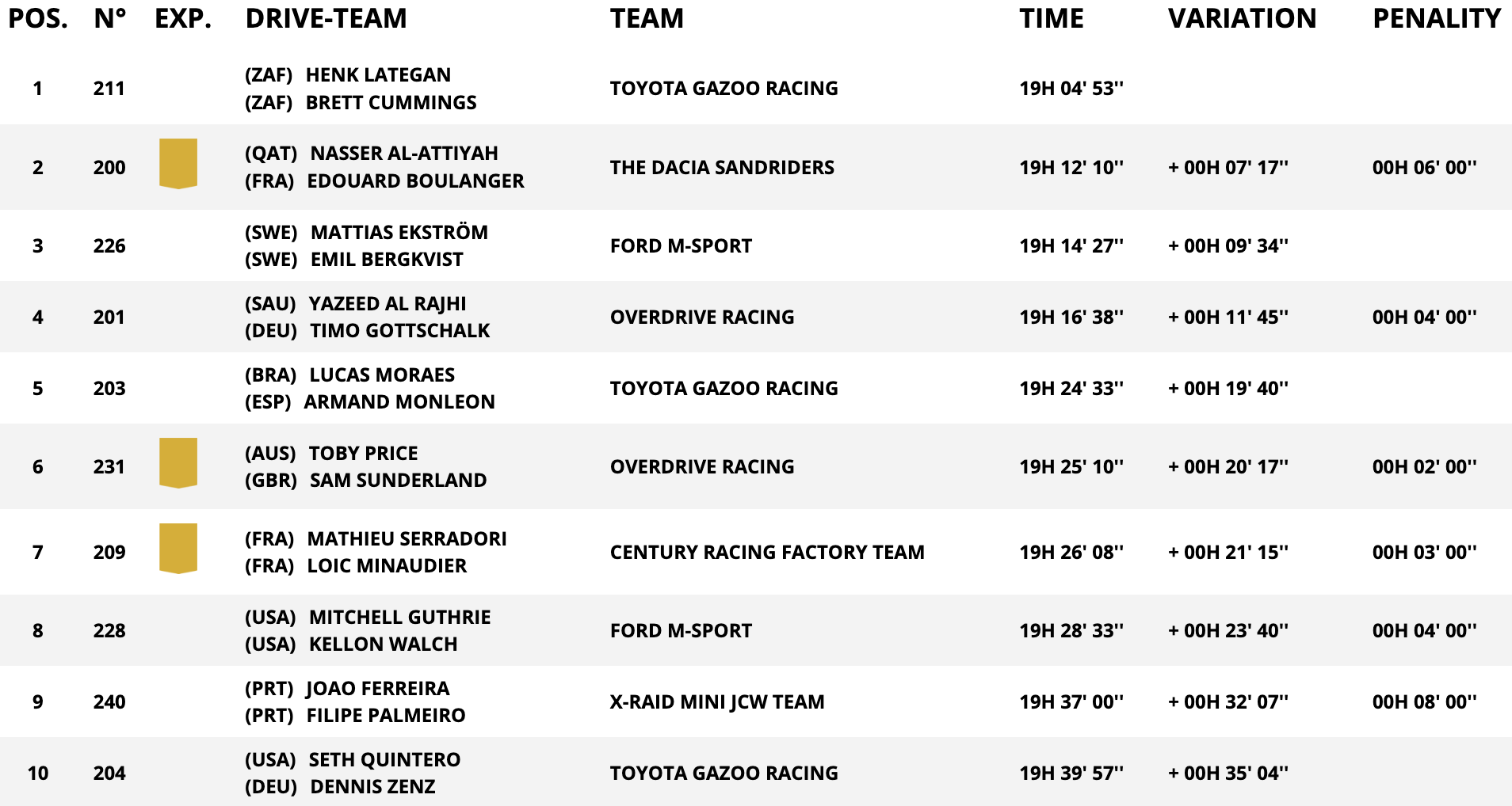 Nella classifica generale, grazie anche alla penalità di 6’ comminata a Nasser Al-Attiyah nei giorni precedenti, è ancora Henk Lategan (oggi 13°) a mantenere il comando delle operazioni. Il sudafricano conserve un vantaggio di 7’17” sul pilota del Qatar e di 9’34” su Mattias Ekström, che mette i piedi sul podio sfruttando la giornata storta di un Yazeed Al Rajhi incapace di andare oltre il 18° posto nella Stage 3. 5ª posizione per Lucas Moraes, che sopravanza la coppia Price – Sunderland, mentre l’errore di oggi costa carissimo a Sebastien Loeb in termini di classifica generale: l’alsaziano è ora 16° assoluto, distante 1H 14’45” dal crono di Lategan.