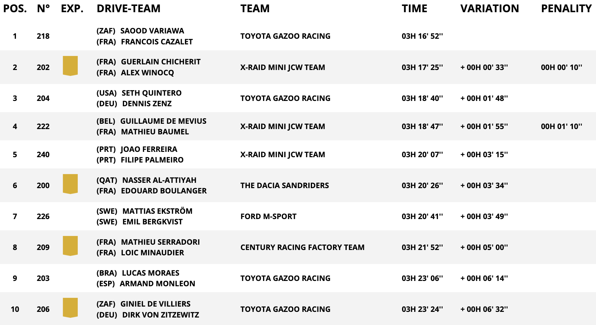 A fare la voce grossa lungo i 327 km cronometrati della Stage 3 è stato Saood Variawa, alla prima vittoria di tappa della sua carriera da Dakariano. Il sudafricano, munito di una sempre efficace Toyota Hilux, ha impiegato 3H 16’52” per completare la sezione di gara, staccando per 33” un redivivo Guerlain Chicherit e per 1’48” Seth Quintero, tornato sul podio dopo le difficoltà incontrate nella 48H Crono. Ai piedi del podio, rallentato da una penalità di 1’10”, si è messo Guillaume de Mevius, mentre Joao Ferreira ha artigliato la top five di giornata regalando un’altra soddisfazione a Mini: sono infatti ben tre le vetture del team X-Raid all’interno delle prime cinque posizioni. Nasser Al-Attiyah si è oggi dovuto accontentare della 6ª posizione, riuscendo comunque a contenere i danni dati i soli 3’34” di ritardo accumulati dalla vetta della classifica, con Mattias Ekström che ha invece chiuso al 7° posto con una delle poche Ford Raptor T1+ superstiti. 8ª piazza per Mathieu Serradori, mentre Lucas Moraes e Giniel de Villiers hanno completato la top ten di questa Stage 3 occupando rispettivamente la 9ª e la 10ª posizione con distacchi dalla vetta di poco superiori ai 6’.