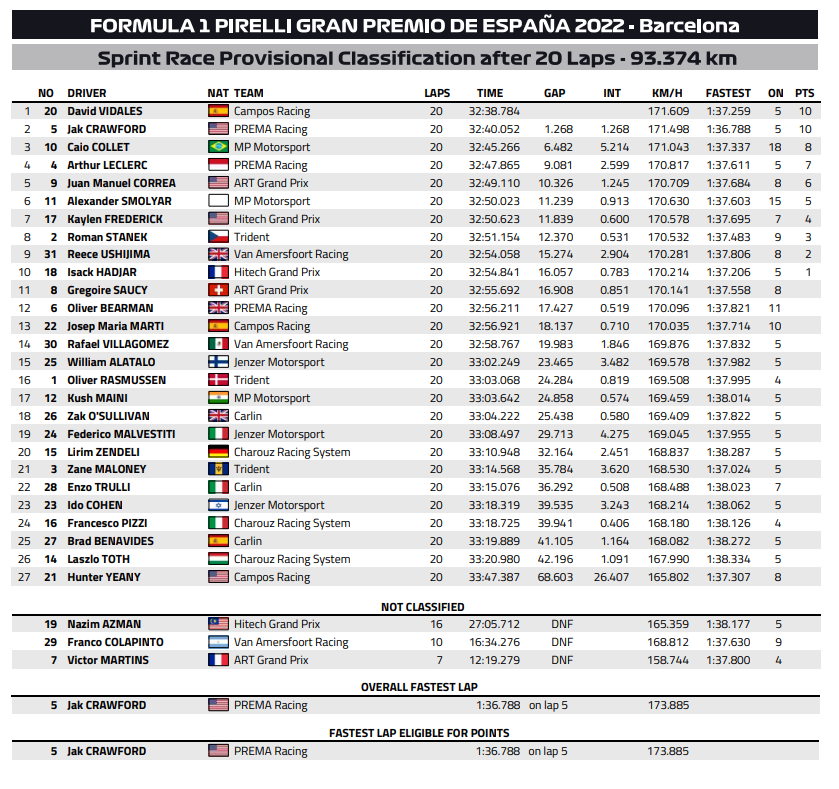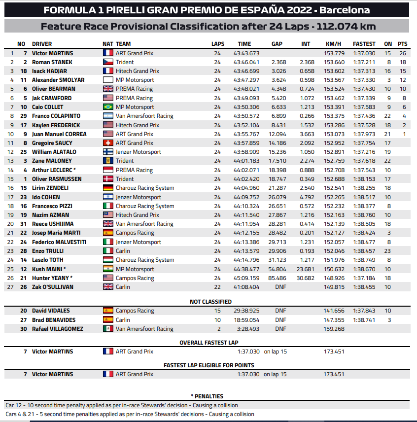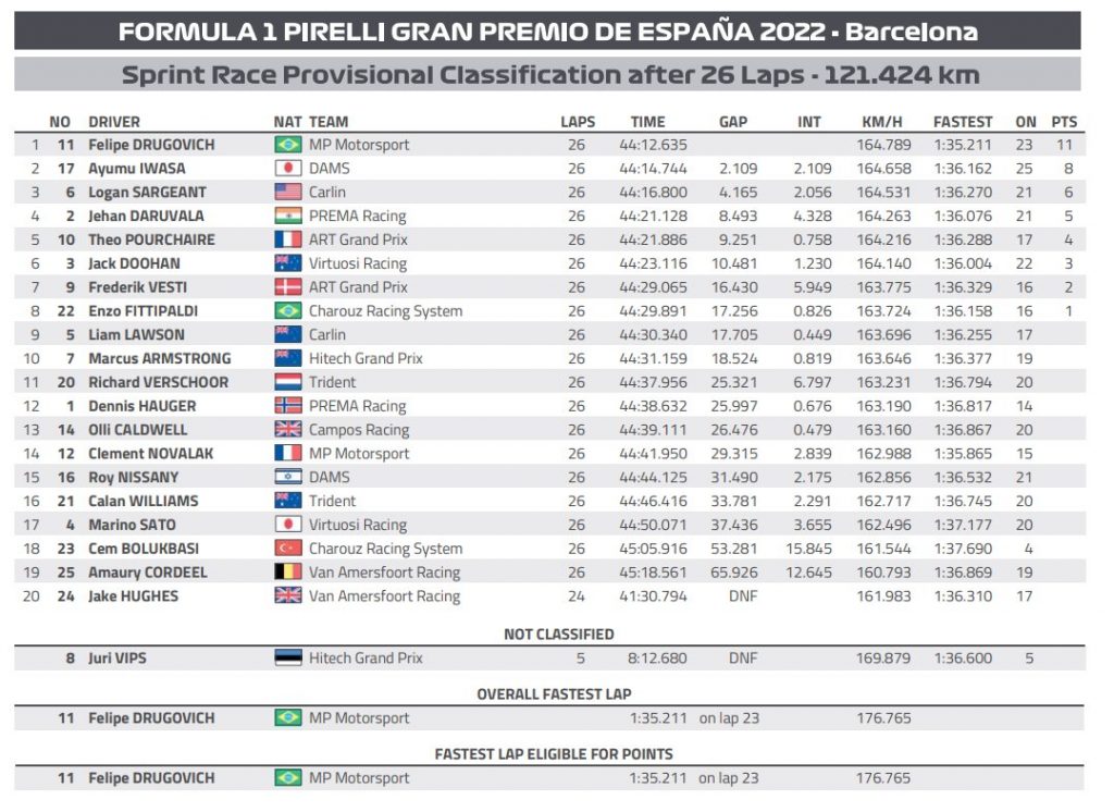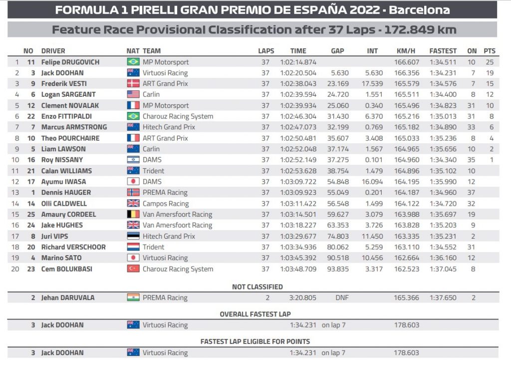 Il mattatore del weekend è stato Felipe Drugovich, senza alcuna discussione. Il pilota brasiliano ha vinto entrambe le gare del weekend, senza neanche partire dalla prima fila, e facendo il tris con la vittoria del 2020. Nella Sprint Race è partito quarto dopo una penalità di tre posizioni che gli ha impedito di partire dalla pole della griglia rovesciata, ma già alla prima curva è riuscito a sfilare primo, conducendo la gara autorevolmente; ma è stato nella Feature Race in cui ha dimostrato veramente il suo talento: partito decimo, ha guadagnato qualche posizione al via, portandosi fino al quinto posto prima delle soste. Ed è stato proprio lì che ha fatto la differenza, perché con una gestione magistrale ha allungato lo stint di sei giri rispetto al leader Doohan. Neanche un errore al pit stop del suo team gli ha impedito di far funzionare l’overcut, perché con le gomme più fresche è stato poi bravissimo a recuperare le posizioni e a vincere con più di cinque secondi di vantaggio su Doohan. Era dal round di Baku del 2016 che un pilota non vinceva entrambe le gare, e in quel caso fu Giovinazzi a fare doppietta. Non benissimo Pourchaire, che era giunto a Barcellona come leader del campionato, ma in entrambe le gare ha chiuso fuori dalla top 5, perdendo tantissimi punti da Drugovich. Adesso il pilota brasiliano comanda la classifica con 86 punti, ventisei in più del francese, mentre Daruvala resta terzo a 41 nonostante il ritiro in Gara 2 per un problema di affidabilità.